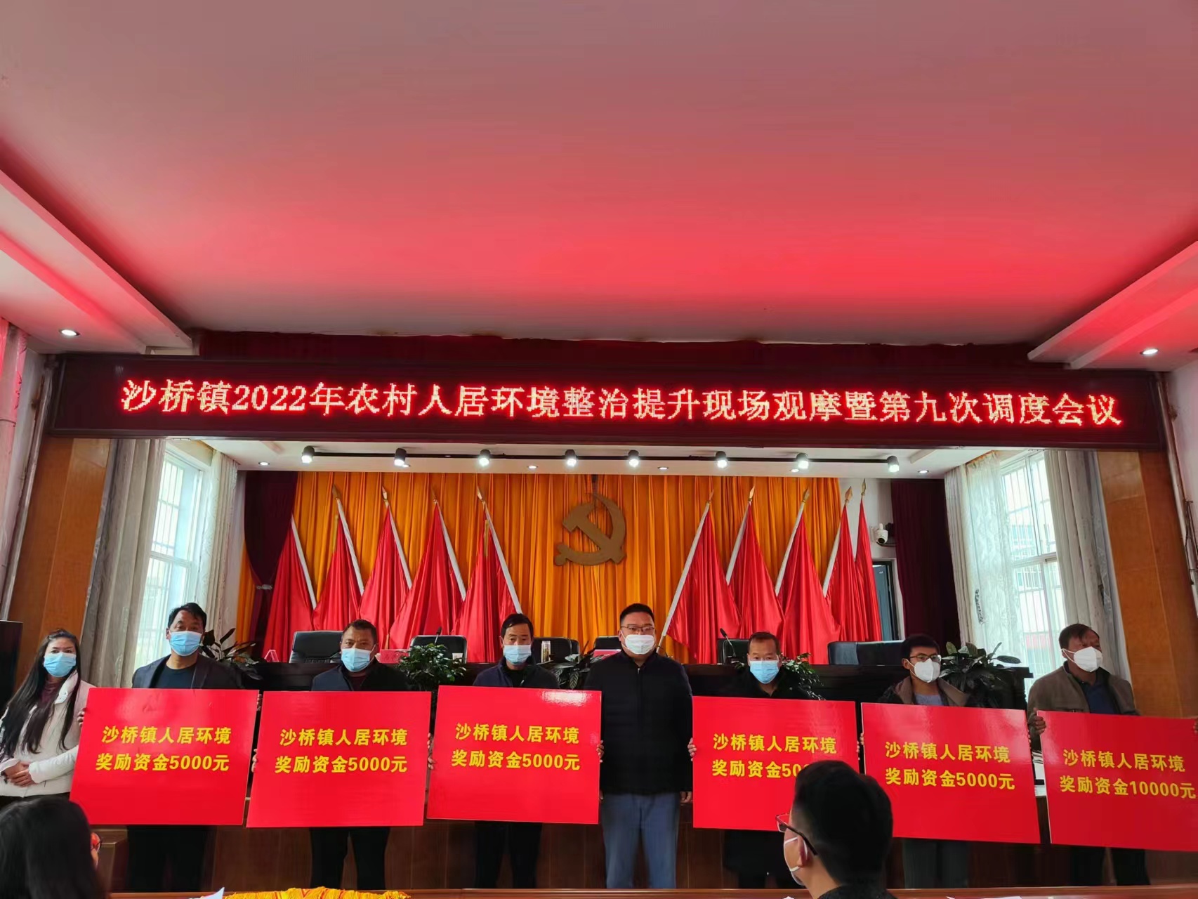 实地观摩结束后,全体人员在镇政府大会议室召开工作调度会议。会上,镇人民政府主要领导对12月份人居环境整治提升考核考评结果进行通报,评比结果前3名的村委会被授予红旗并作交流发言,评比结果后3名的村委会被授予黄旗并作表态发言,对连续2次评比结果排前3的村委会给予5000元的奖励。此次会议针对本年度月评比结果多次排前3的村委会发放全年农村人居环境整治提升奖金共计35000元。