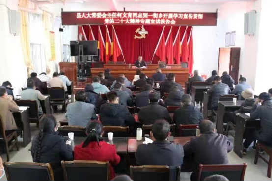 2022年1月10日上午,县人大常委会主任何文育同志到一街乡开展学习贯彻党的二十大精神专题宣讲。一街乡全体干部职工、12个村书记、主任、驻村工作队长80余人参加会议。