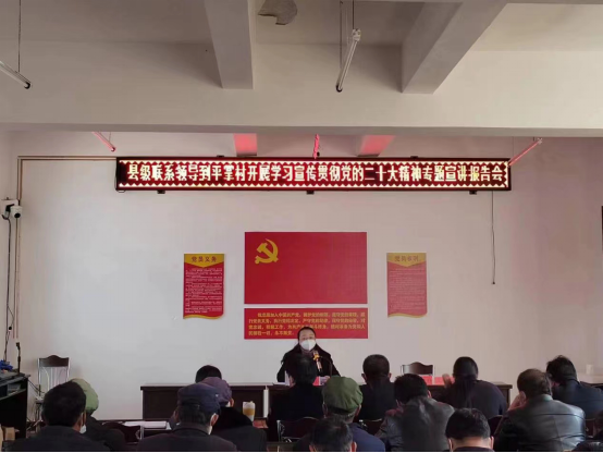 2023年1月11日下午,县委常委、县纪委书记、县监委主任李海琼到一街乡平掌村开展学习宣传贯彻党的二十大精神专题宣讲,平掌村“两委”班子、驻村工作队员及部分党员代表共40余人参加会议。