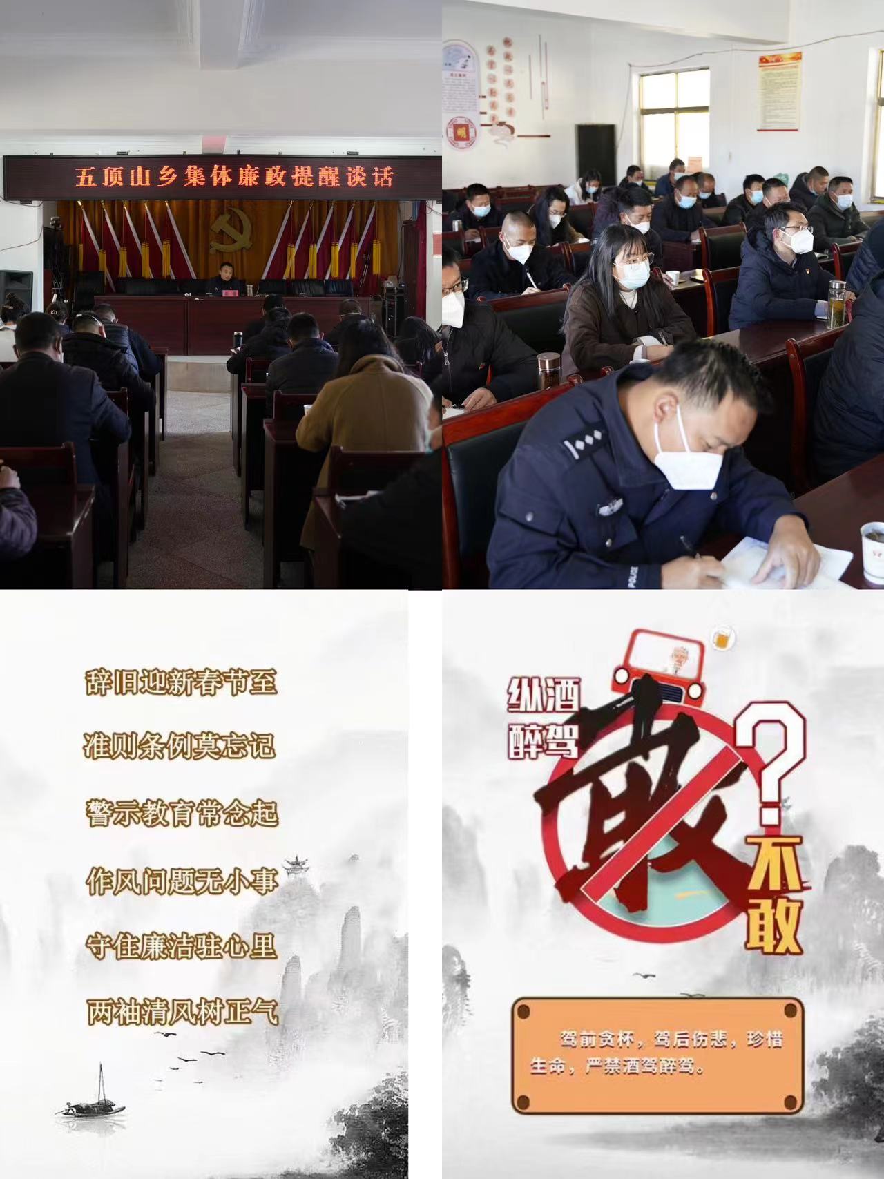 为进一步强化纪律和规矩意识,紧绷思想作风之弦,持续深入贯彻落实中央八项规定精神,持之以恒抓好作风建设,努力营造廉洁过节、风清气正的良好氛围。五顶山乡开展春节前廉政提醒谈话。要求全体党员干部要严以律己,遵规守纪,自觉坚守政治纪律和政治规矩,慎言慎行、务实清廉,自觉遵守中央八项规定精神,崇廉尚俭、文明过节。要求全体干部职工要严禁酒驾醉驾,管住手、管住身、管住心,坚持“高线”,守住“底线”,不踩“红线”、筑牢“防线”。