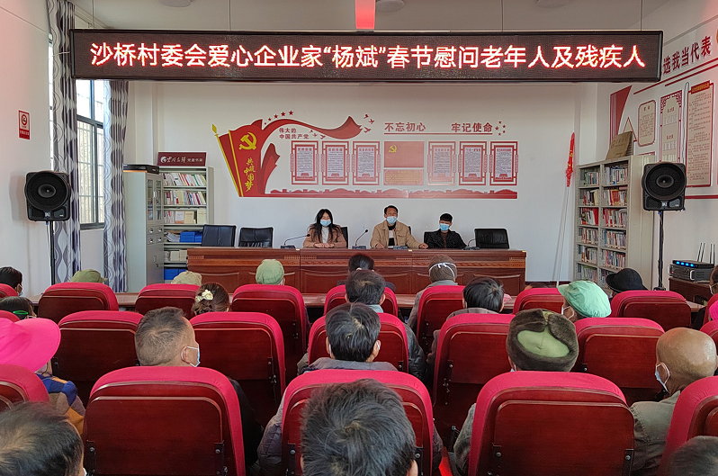 2023年新春佳节来临之际,沙桥镇本土创业爱心人士杨斌回馈乡亲捐赠仪式在沙桥镇沙桥村委会大会议室举行,此次捐赠对象主要为沙桥村困境儿童3人、残障人士11人,困难大学生1人、重病户5人、60岁以上老年人145人,共捐赠人民币5万元。