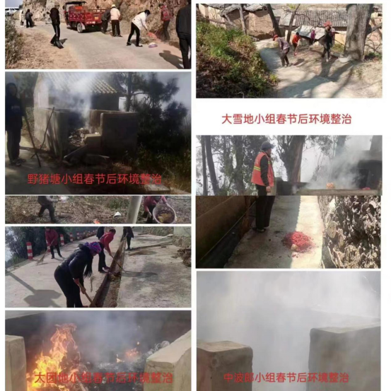 全体干部职工、村干部、村民带着扫把、火钳、垃圾袋等清洁工具在乡内主干道、集贸市场、各村道路等地清除杂物,捡拾果皮、烟头、炮仗纸屑、塑料瓶等垃圾,并对垃圾进行集中处理和焚烧。