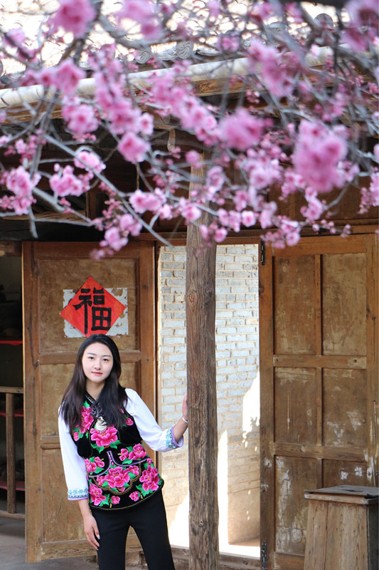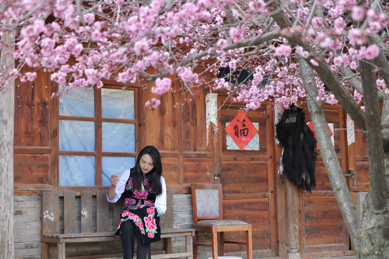 年轻的彝家姑娘在梅花树下精心地绣彝族绣片,一花一叶都成为她指尖舞动的精灵。