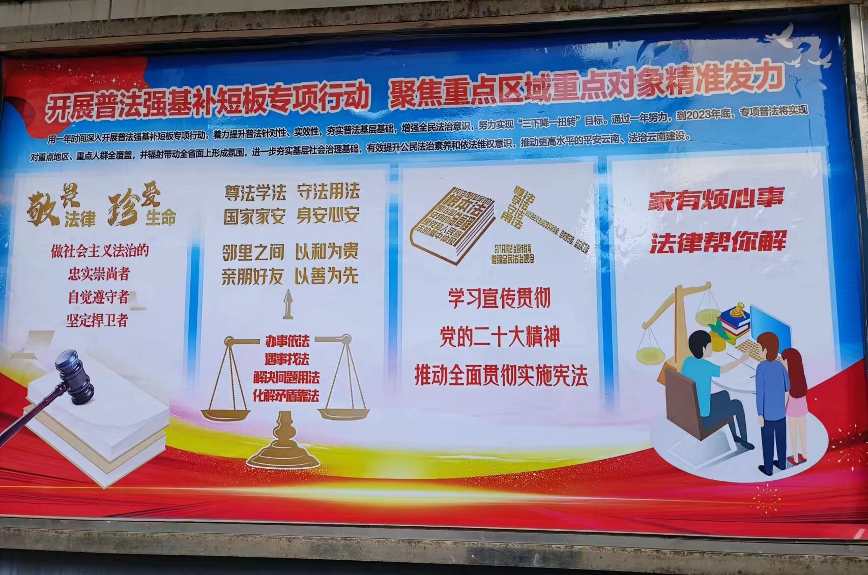 为全面贯彻落实党的二十大关于法治建设部署要求,推动省、州、县关于2023年普法强基补短板专项行动落地见效,近日,雨露乡着力提升普法工作针对性和实效性,结合雨露乡实际开展系列普法活动,让普法行动深入基层、深进人心。