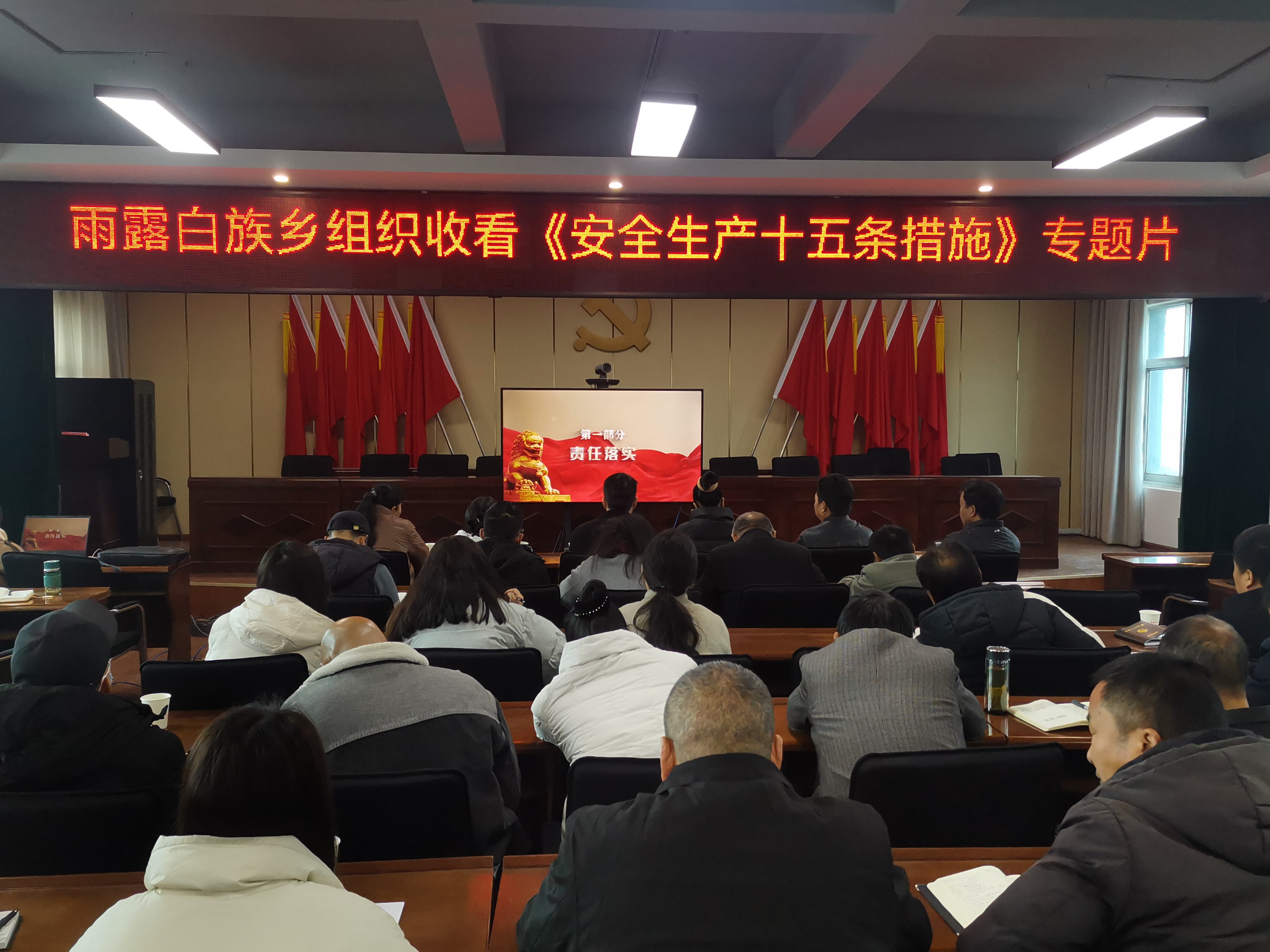 开展宣传教育,营造浓厚氛围。组织全体干部职工、村“四职”干部集中收看《生命重于泰山电视》《安全生产十五条措施》专题片,树牢干部的安全发展意识。利用雨露乡传统的正月初八灯会和赶集日,在全乡范围内开展“遵守安全生产法,当好第一责任人”为主题的安全生产宣传活动,现场发放安全生产宣传知识手册等宣传资料500余份,现场接受群众咨询150余人次,向过路群众宣传安全生产相关知识,受安全教育群众达3500人次,把安全生产工作宣传到千家万户,营造良好安全生产氛围。