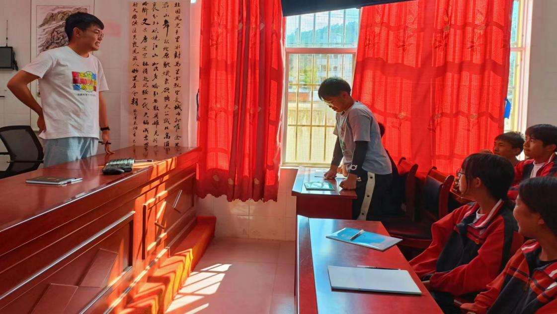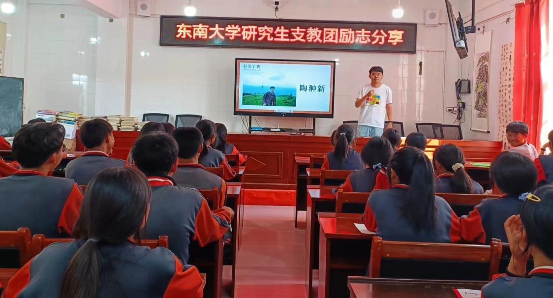 仪式的最后,初三的同学们还有幸听到了东南大学研究生支教团团长、云南分队队长陶翀新的励志分享。陶老师从一些自身的经历给同学们进行分享,他充满激情且风趣幽默的语言让同学们受到了很大的鼓舞,点燃了同学们奋发学习的热情,激发了他们的斗志和干劲,更加坚定了他们奋斗的决心和勇气。