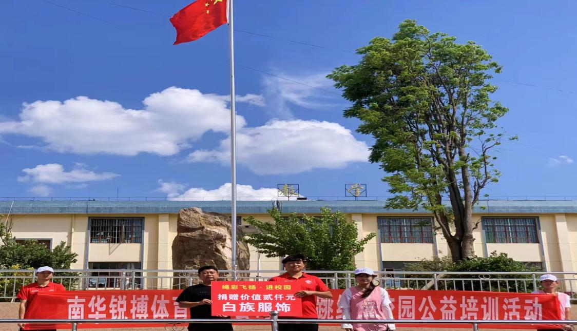 爱心点燃希望,真情传递温暖。爱心是土地久旱时的一场甘霖、是寒冷冬季里的一束阳光、是茫茫沙漠里的一泓清泉。5月26日下午,雨露初级中学校园里回荡着爱的旋律,两场捐赠及公益活动正在有序地进行。下午3点,我校接受了南华县锐搏体育有限公司董事长范晓东捐赠的价值2000元的白族服饰,这不仅仅是物质上的帮助,更重要的是对学生精神上的鼓舞,给我们农村孩子送来了温暖。除此之外,王殷福经理还带领了杨开贵、杨雪妮、徐炳兴三名教练员在七八年级开展了花式跳绳公益培训活动,为同学们枯燥的学习生活增添了一抹色彩。