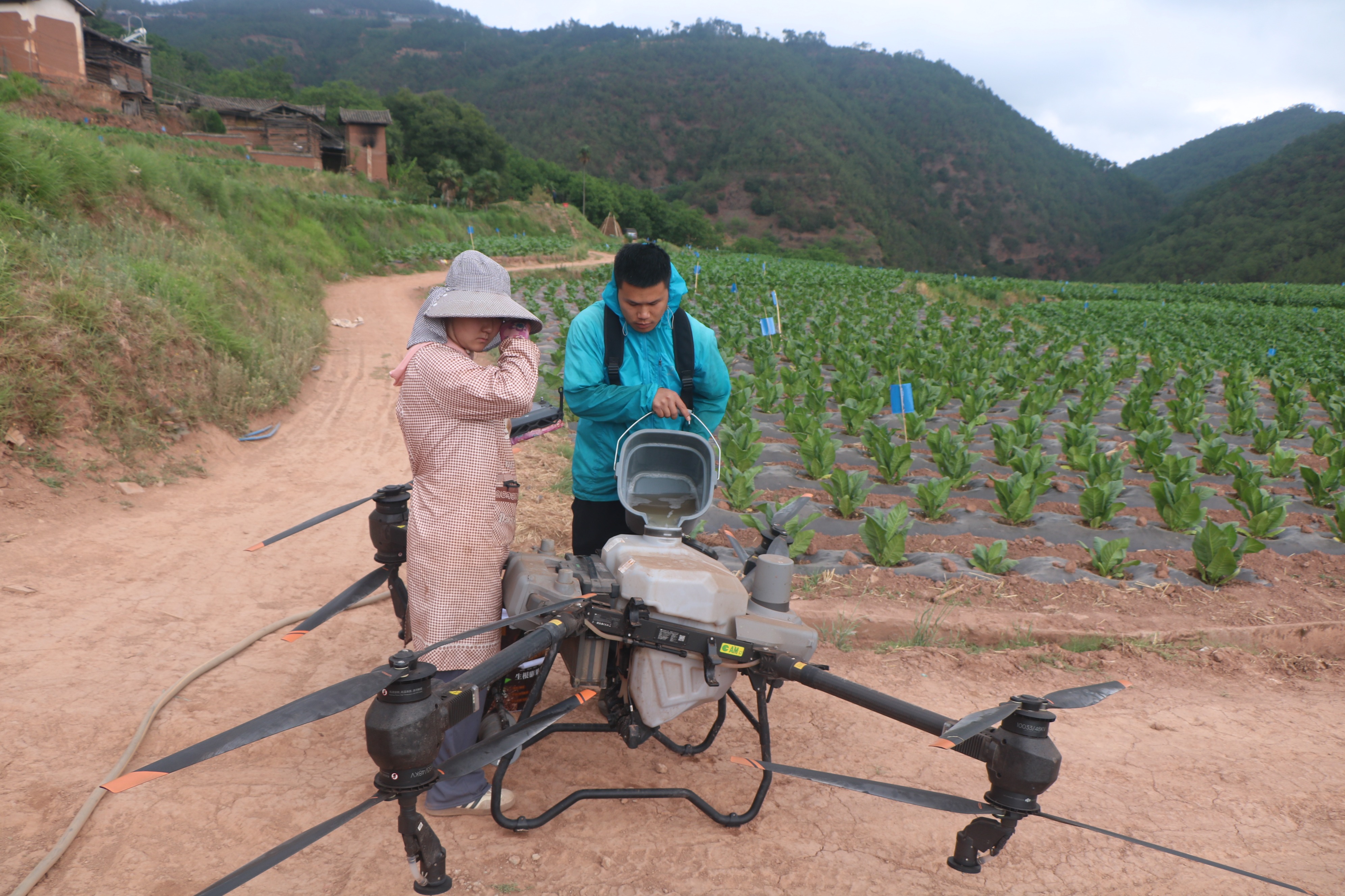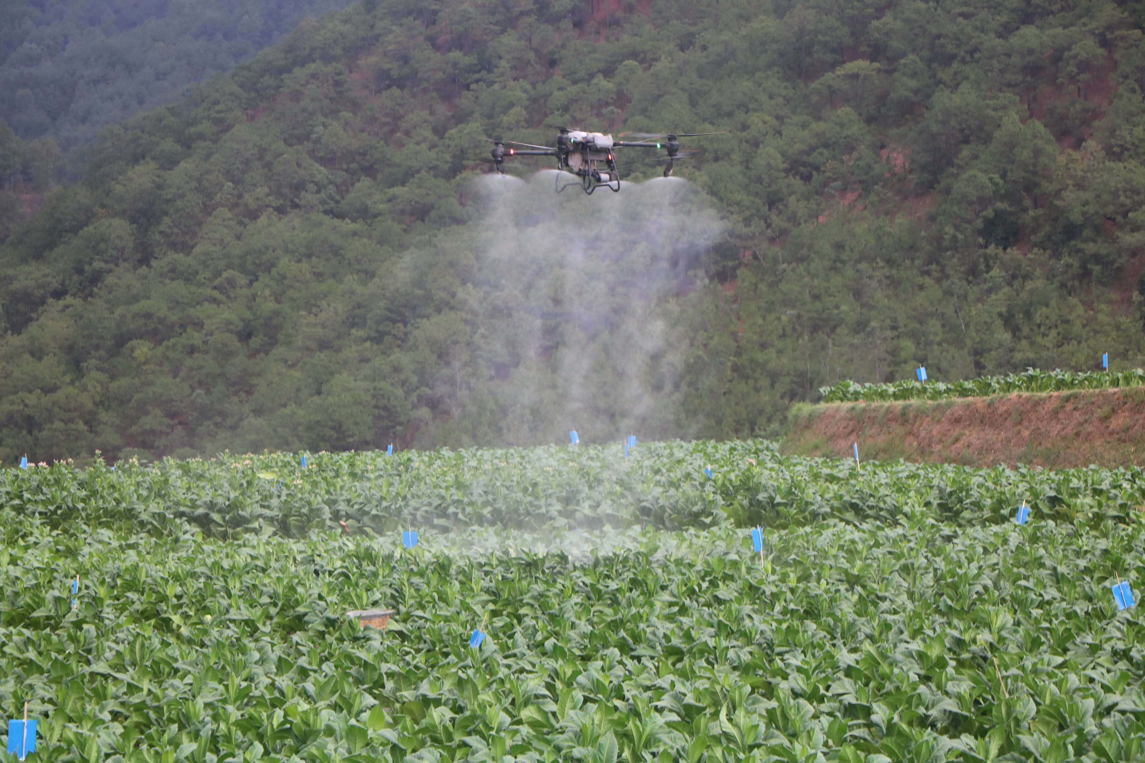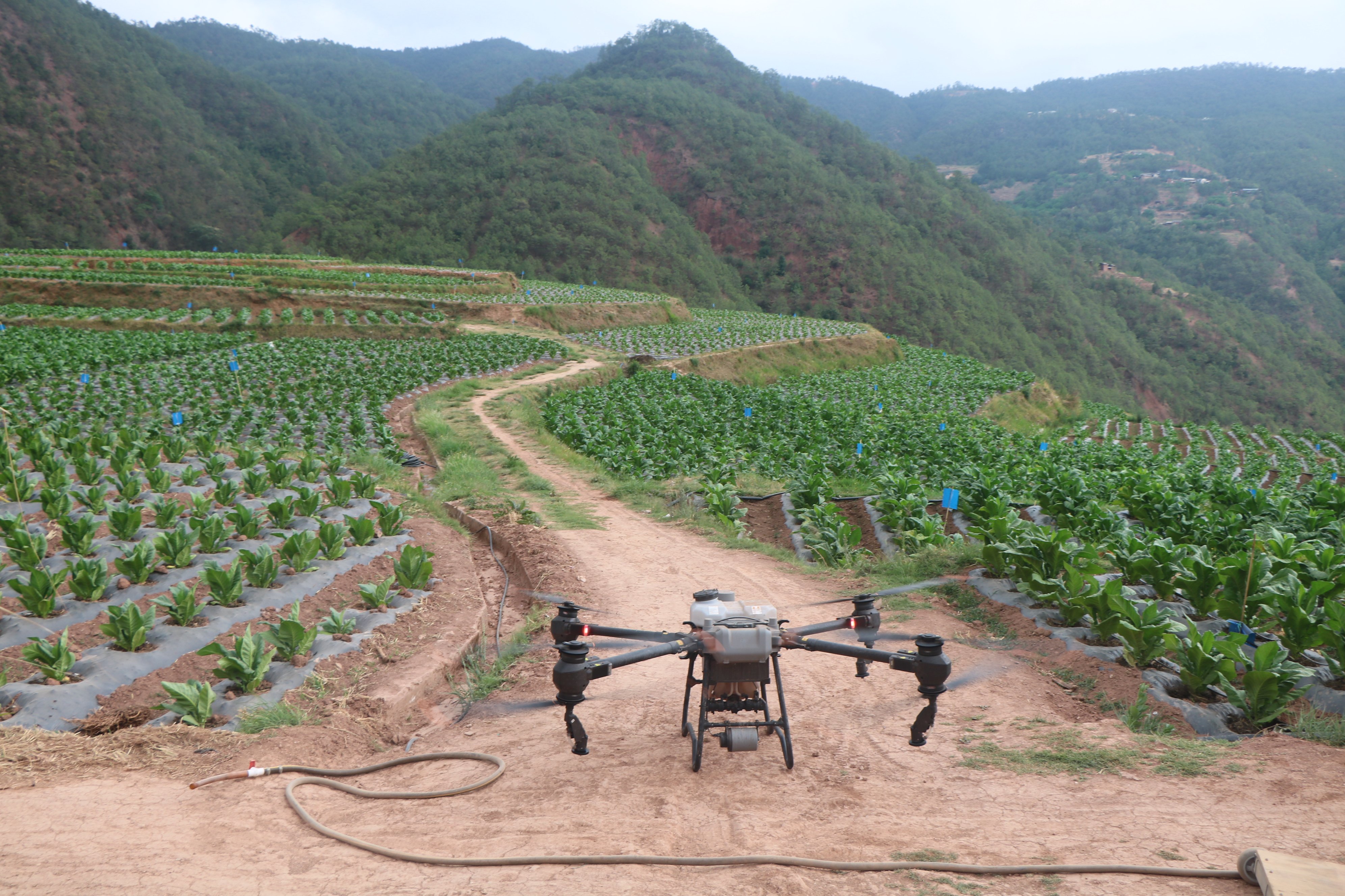 走进南华县五街镇迤黑地村委会段家小组,在层层叠翠的烟田上空,一架无人机在技术人员的操作下,穿梭于烤烟田上空,只见雾化的农药随着无人机的移动,均匀地喷洒在烟叶上。