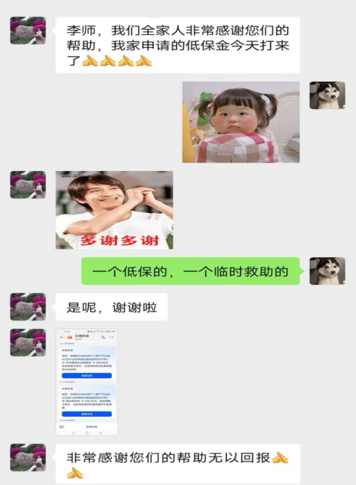 “吕大哥,今天收到我们家申请的低保金和临时救助金了,非常感谢你们,感谢党委政府对我们的关心,我们全家人都无以回报。”这是南华县红土坡镇簪花村民胡某某给我们社会事务办工作人员发的微信信息。