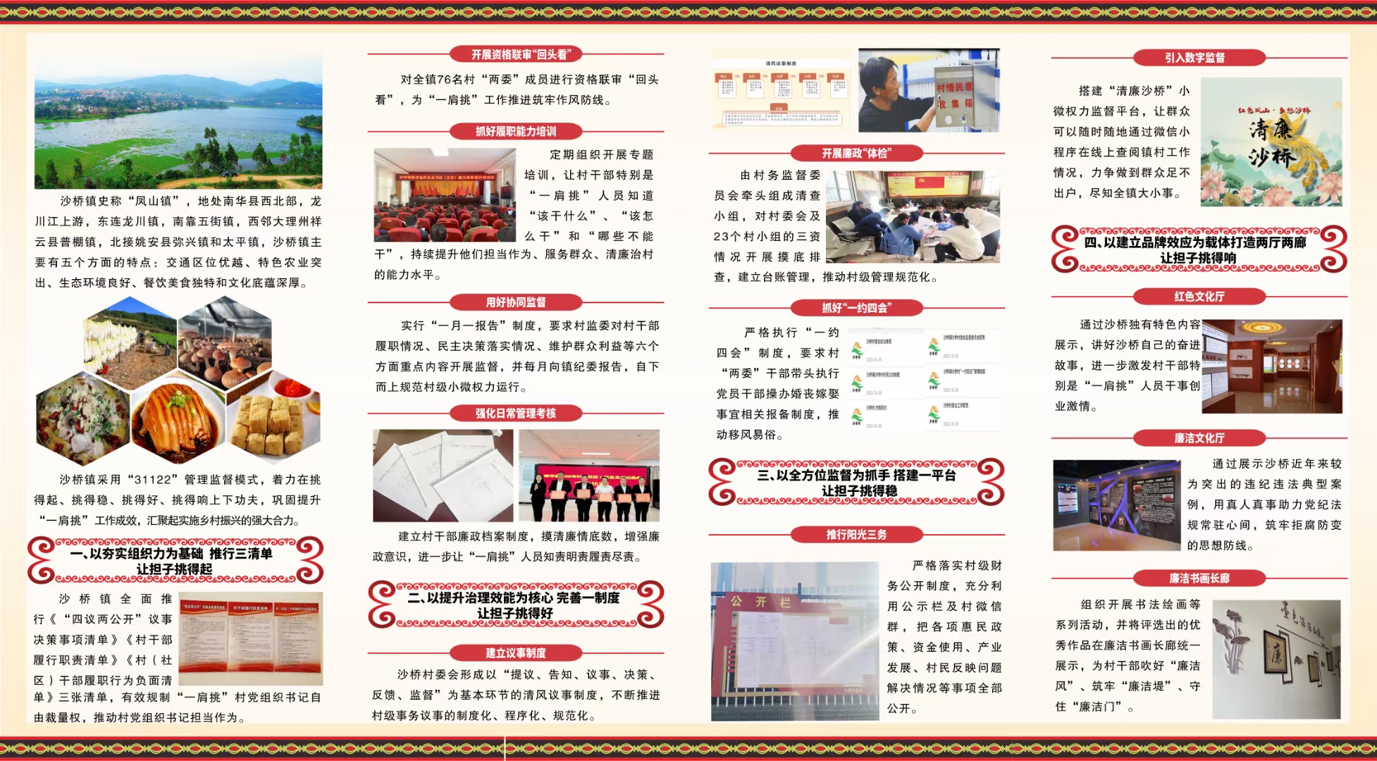 最后的“22”是指以建立品牌效应为载体,打造两厅两廊,让担子挑得响。沙桥镇以廉洁文化为载体,与传统文化相融合,依托红色凤山文化,深入挖掘沙桥特色元素,建立品牌效应,以“红色凤山清廉沙桥”为主题打造建成了红色文化厅、廉洁文化厅、廉洁文化长廊和阳光政务长廊。