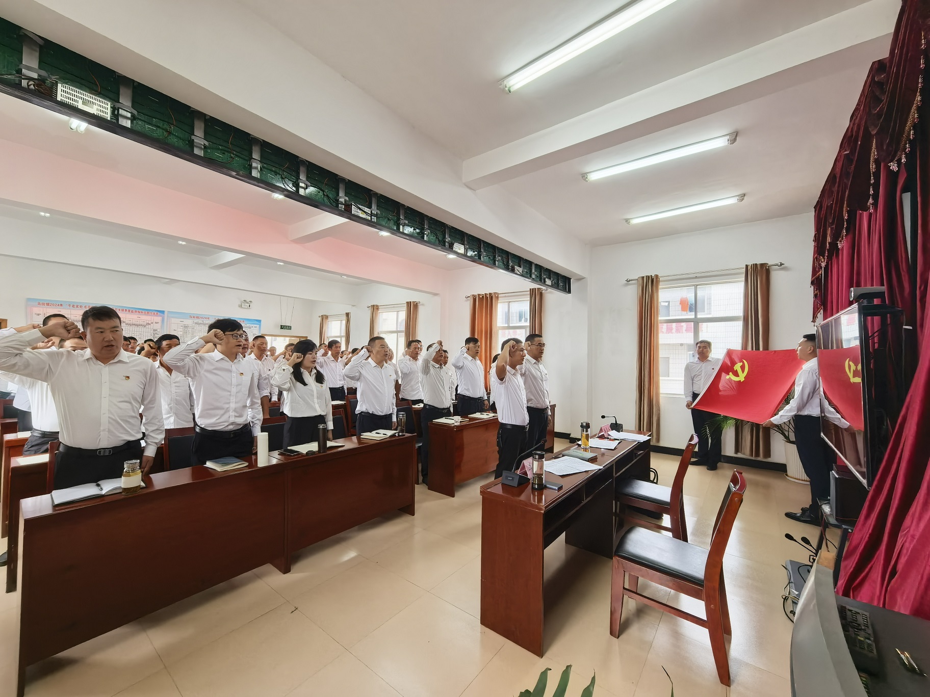 面对鲜红的党旗,全体党员同志握拳宣誓重温入党誓词,字字掷地有声,句句铿锵有力,表达了对党的赤诚忠心,也再次让党员们时刻牢记自己所肩负的使命和责任。