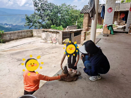 而在同一条山路的尽头的另一户院子里,小云、小琴兄妹正围着一只活泼的小狗嬉闹。“爱心妈妈”小张蹲在一旁,帮妹妹拢了拢被风吹乱的刘海,毫无隔阂地加入了这场童真的嬉戏。“阿姨你看,它会跟人跑啦!” 小狗摇着尾巴在三人间穿梭,追逐的笑声、逗弄小狗的稚语此起彼伏,院子里的欢声不断,是空寂院落里久盼的甘霖。