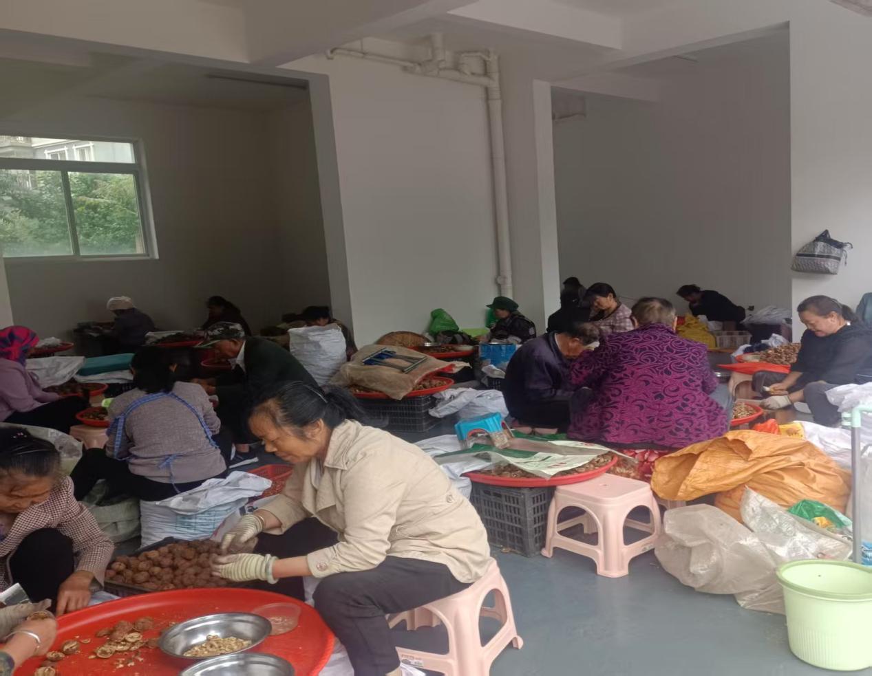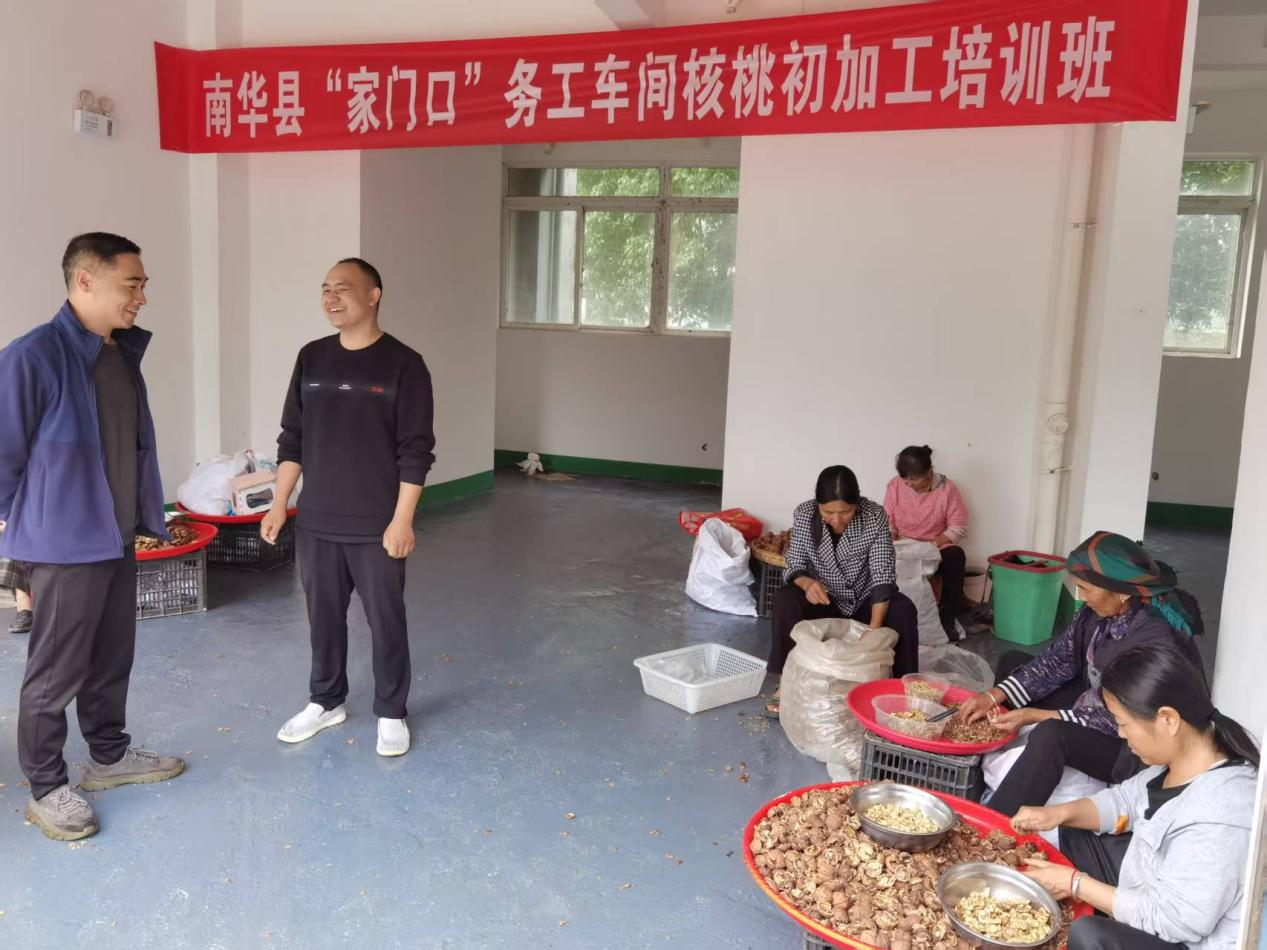眼下正是核桃初加工的时节,走进南华县“家门口”务工车间,一阵阵欢声笑语传来,只见五六十名工人三五成群地围坐在一起,熟练地将果仁饱满、皮薄个大的核桃进行破壳、取仁、分拣,一派繁忙的场景……