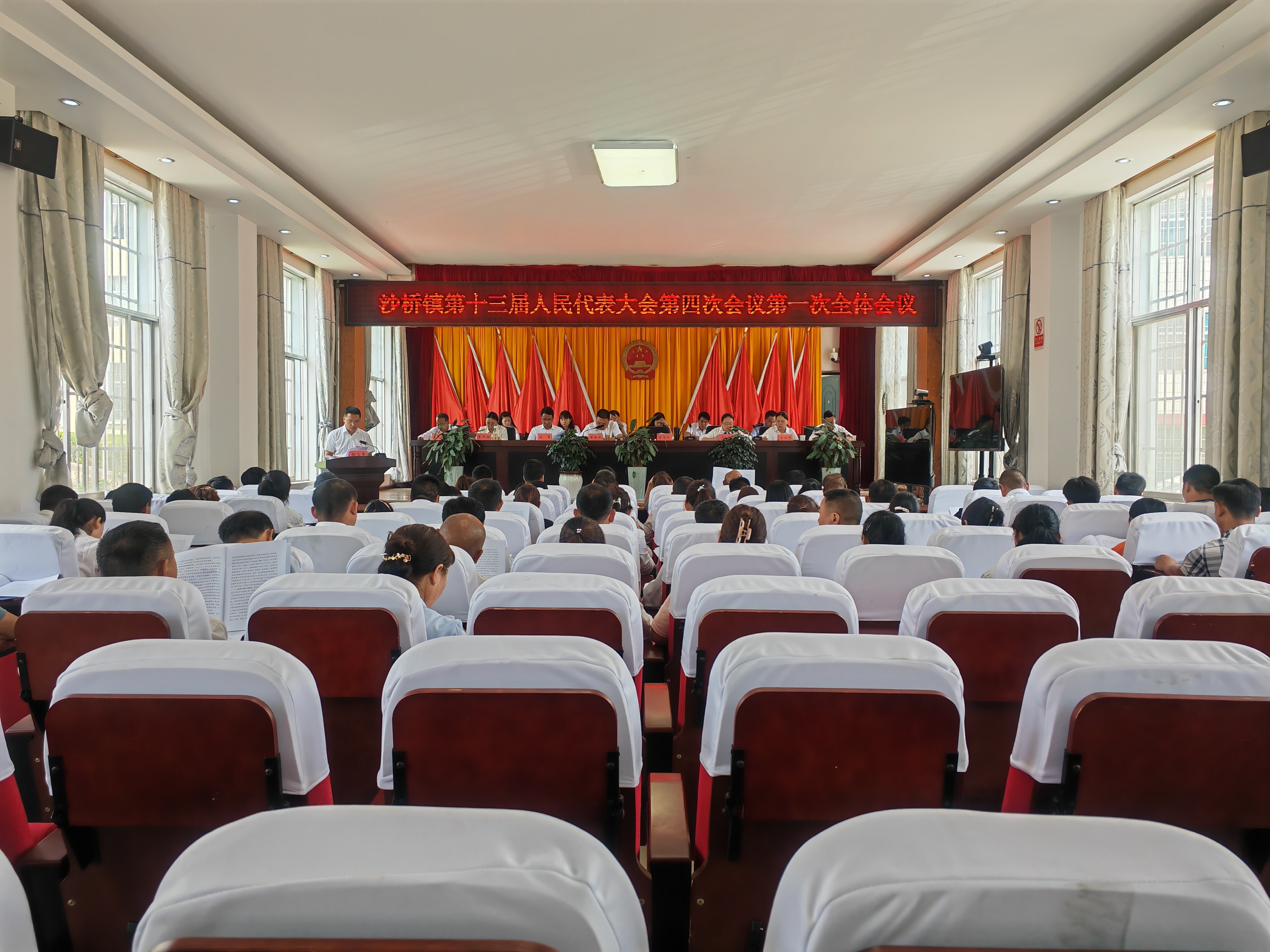 8月18日,沙桥镇第十三届人民代表大会第四次会议在镇政府大会议室开幕。来自全镇各条战线上的人大代表肩负着全镇人民的重托和殷切期望,汇聚一堂,共谋沙桥发展大计,共绘沙桥发展宏伟蓝图。本次大会应到代表64名,因事因病请假10名,实到会代表54名,符合法定人数。上午11时,大会在雄壮的国歌声中拉开帷幕。