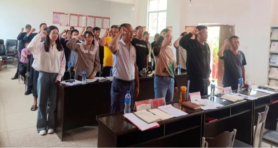 重温入党誓词,坚定理想信念。鲜红的党旗下,乡挂包领导、村四职、驻村工作队和党员一起重温入党誓词,右手握拳,庄严宣誓,“我志愿加入中国共产党……随时准备为党和人民牺牲一切,永不叛党。”铿锵有力的宣誓,再次体会入党之初的热忱,进一步强化了党员意识,坚定了党员信念,激发了党员勇于担当、干事创业、创先争优的工作热情。