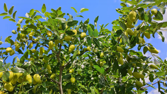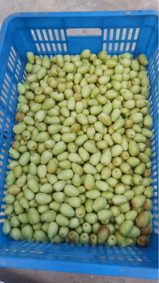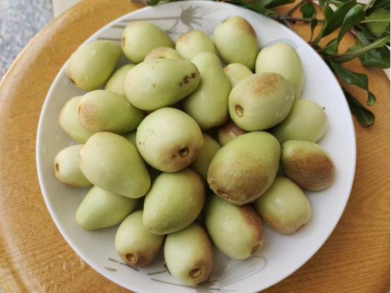 小枣园位于团山村礼社江流域河谷地带,这里全年光照充足、水质优良,种植的热带水果极为优质。因为拥有适宜的生长环境,这里的小枣与普通小枣相比,早熟、丰产、质优,每年6月底7月初就成熟,比其他地方早2个月,被称为天下第一“早”。进入枣园,目之所及,映入眼帘的是一串串一团团挂满枝头硕大的小枣。虽说是小枣基地,可是枣子一点都不小,从枣树上摘下一颗核桃大小的枣子放入口中,甜脆可口。