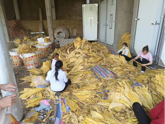 烤房前,烘烤工作井然有序。有的忙着将运送来的烟叶编杆、上竿、入炉烘烤,有的把烘烤好的烟叶进行拆秆分拣,只见工人们将绿色烟叶编杆入炉挂到烤烟房里高温烘烤,等再次打开烤房门,“绿叶”就变成了“金叶”。现场一片赶“烤”忙碌的丰收景象。