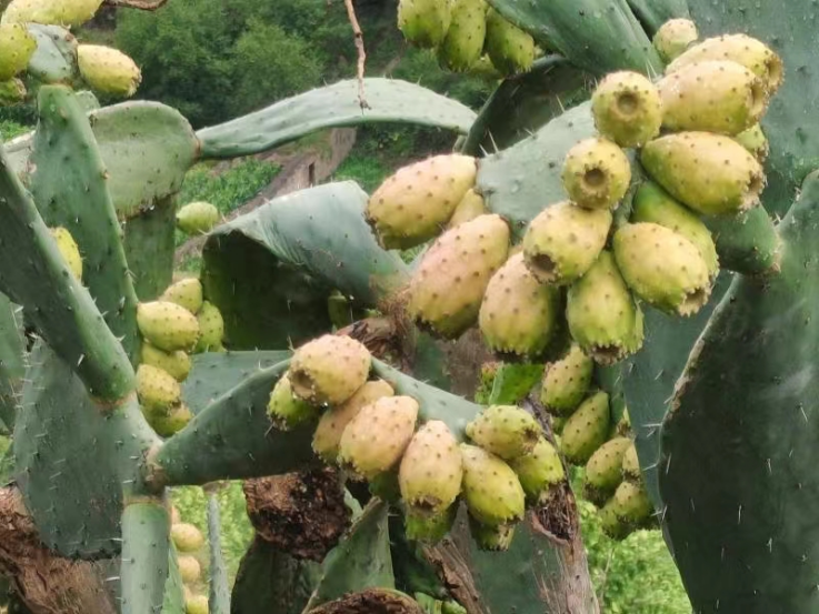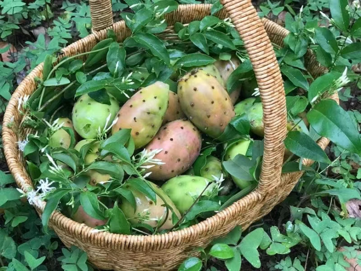 仙人掌是明末时期被引种到中国的,每年4月开花,花瓣或红或黄或粉或白,经过盛夏阳光的洗礼,8月果实成熟,仙人果又叫人参果、莲菜花、延寿果。《本草纲目拾遗》记载:“仙人掌味淡性寒,有清热解毒、消肿止痛,活气血,健脾止泻的作用,多于药用。”仙人掌叶片能吃,果实也能吃,仙人掌果含有丰富的微量元素、蛋白质、氨基酸、维生素、多糖类、黄酮类和果胶等,是一种高蛋白、低脂肪、低糖、高膳食纤维的水果。