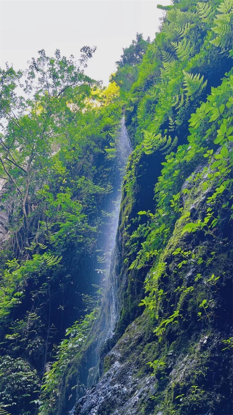 在峡谷幽深处,三五个瀑布群错落有致、气势磅礴。近处的瀑布落差稍低,妩媚秀丽,轻泻而下,显得温柔而内敛,身处其中觉得如纷飞的细雨,轻柔舒缓。最远处的瀑布就张扬了许多,流水从最高处的断崖顶端凌空飞流而下,宛如一条白色的玉带,倒泻于巨石之间,拍打在下面的石头上,激起飞珠溅玉,凌空如烟似雾,真可谓“声震长空惊寰宇,千山万壑荡回音”。仰天长望,阳光从树叶和岩缝中照射下来,透过空气中的水雾,条条彩虹高挂空中,惹得谷底七彩斑斓,整个峽谷变幻莫测,美不胜收。
