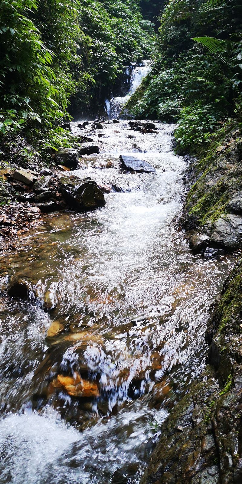 在地势稍缓处,清澈自由的泉水从山涧石缝儿里奔涌而出,流过树的发梢,淌过顽石的细腰,在逼仄的山谷里,哗哗啦啦,淙淙潺潺,谱成天籁之音,不断回响。