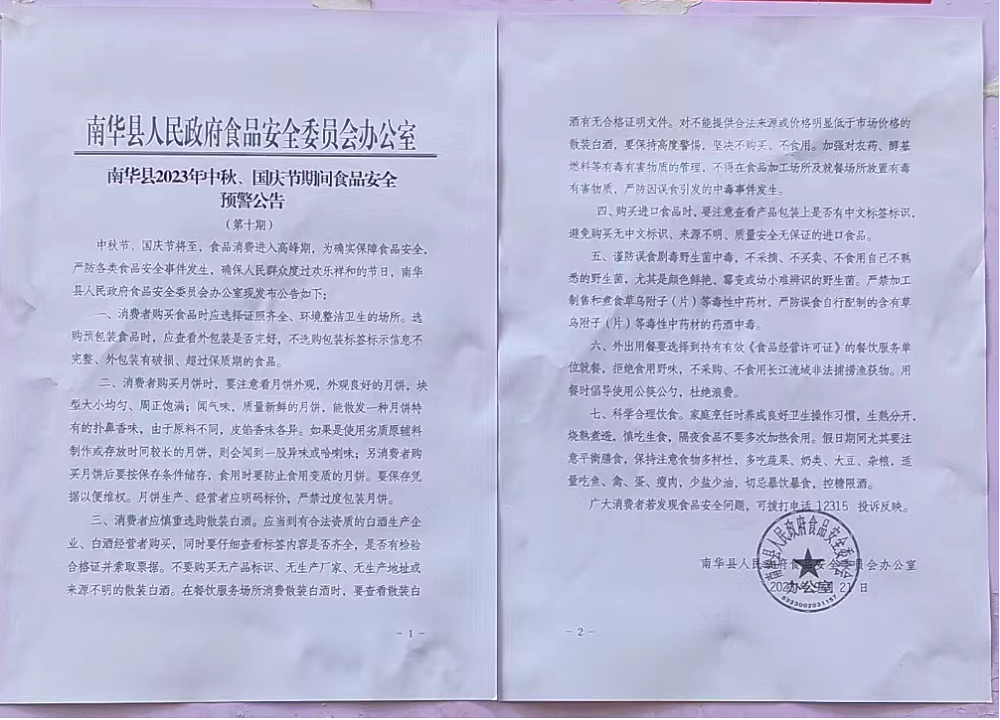 在2023年国庆、中秋来临之际,为保证一街乡群众能吃上放心、安全的食品,过一个祥和的双节,一街乡食安办联合一街乡市场监督管理所于9月20日至9月28日期间对辖区内食品经营店进行了食品安全检查。