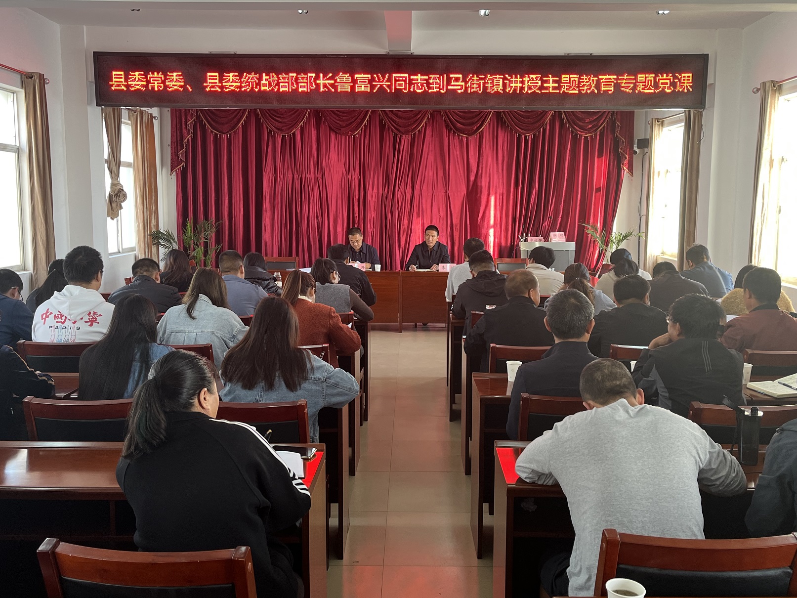 11月15日上午,县委常委、县委统战部部长鲁富兴到马街镇讲授题为《牢记殷切嘱托 狠抓工作落实 努力在新征程中展现党员新担当新作为》的专题党课,激励全镇党员干部把状态提起来、把劲头鼓起来、把标杆立起来,全力推动全年各项目标任务落到实处、见到实效。镇党政班子成员、全体干部职工共计60余人参加会议。
