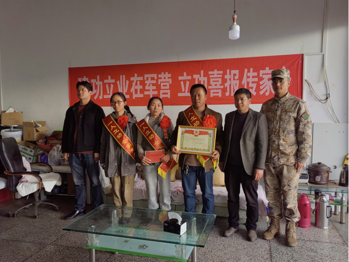 伴随着鞭炮锣鼓声,慰问组一行来到现役军人陈刚家中,工作人员为军人家属披上光荣绶带,送上立功喜报和慰问金,表达对军属的浓浓敬意,向他们致以衷心的祝贺,感谢他们为国家、为部队培养了优秀人才,为家乡争得了荣誉,叮嘱他们有困难及时反映,党和政府会为他们排忧解难,做到让军属暖心、让军人安心。同时,希望他们继续做好儿子的坚强后盾,继续鼓励支持儿子在保家卫国的岗位上积极进取、锤炼意志、增强本领,为强军兴军事业作出新贡献。
