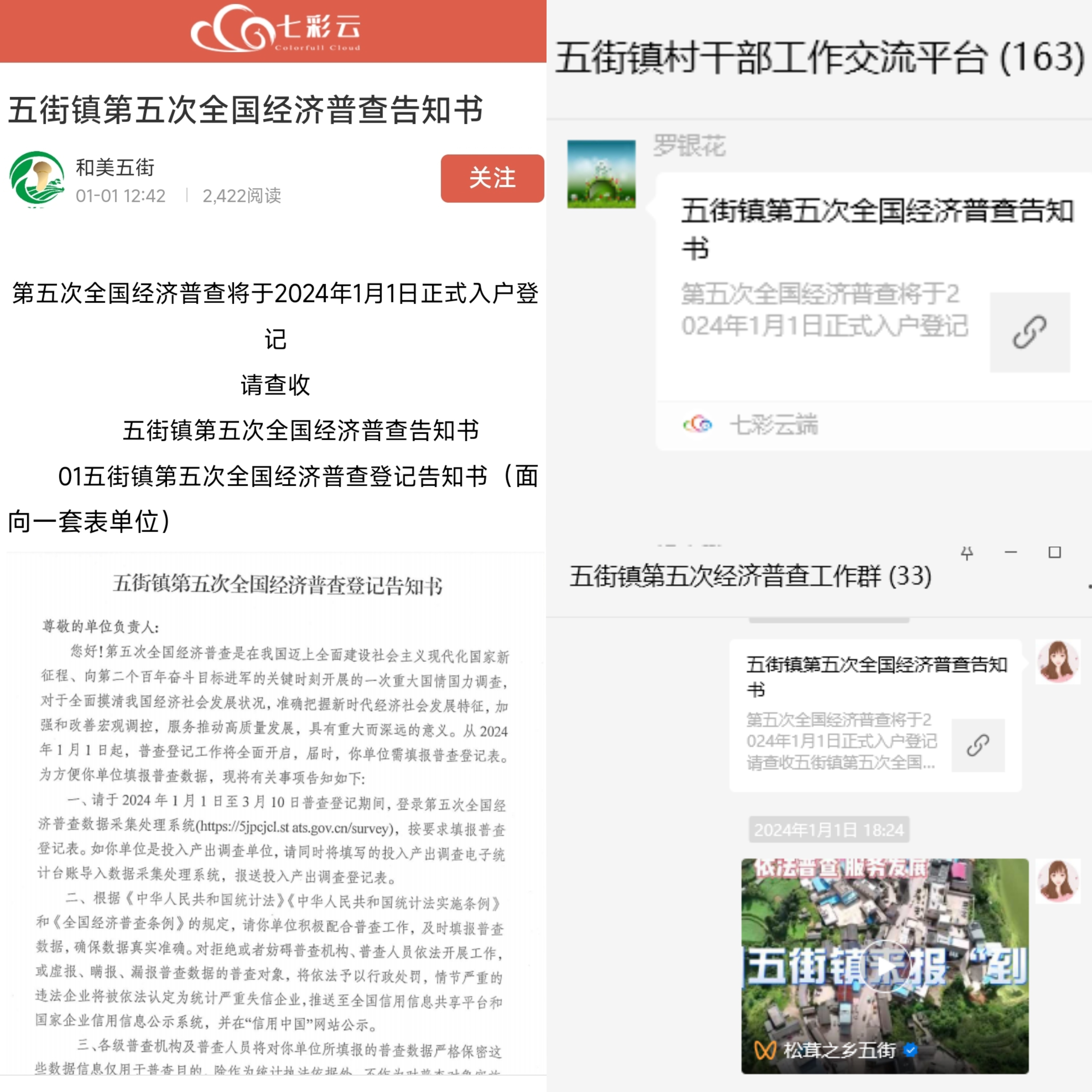 提前谋划预热,谱好普查登记前奏曲。广泛开展正式普查登记告知,及时在七彩云端发布《五街镇第五次全国经济普查登记告知书》和《致第五次全国经济普查对象的一封信》,动员各村委会和职能站所积极转发,进一步提高普查登记知晓度。通过向一套表单位、非一套表单位、个体经营户发送告知书,引导普查对象准备相关证照、统计台账、财务报表等材料,依法配合普查,为普查工作顺利开展奠定了坚实基础。
