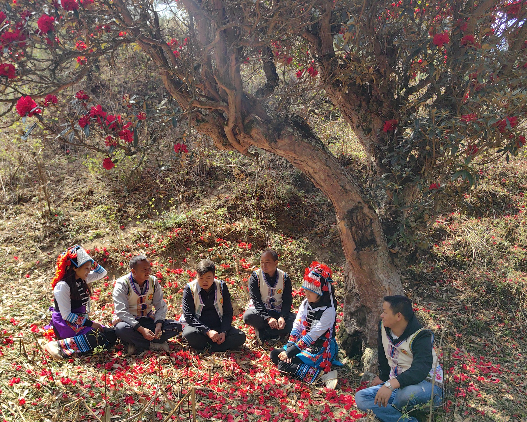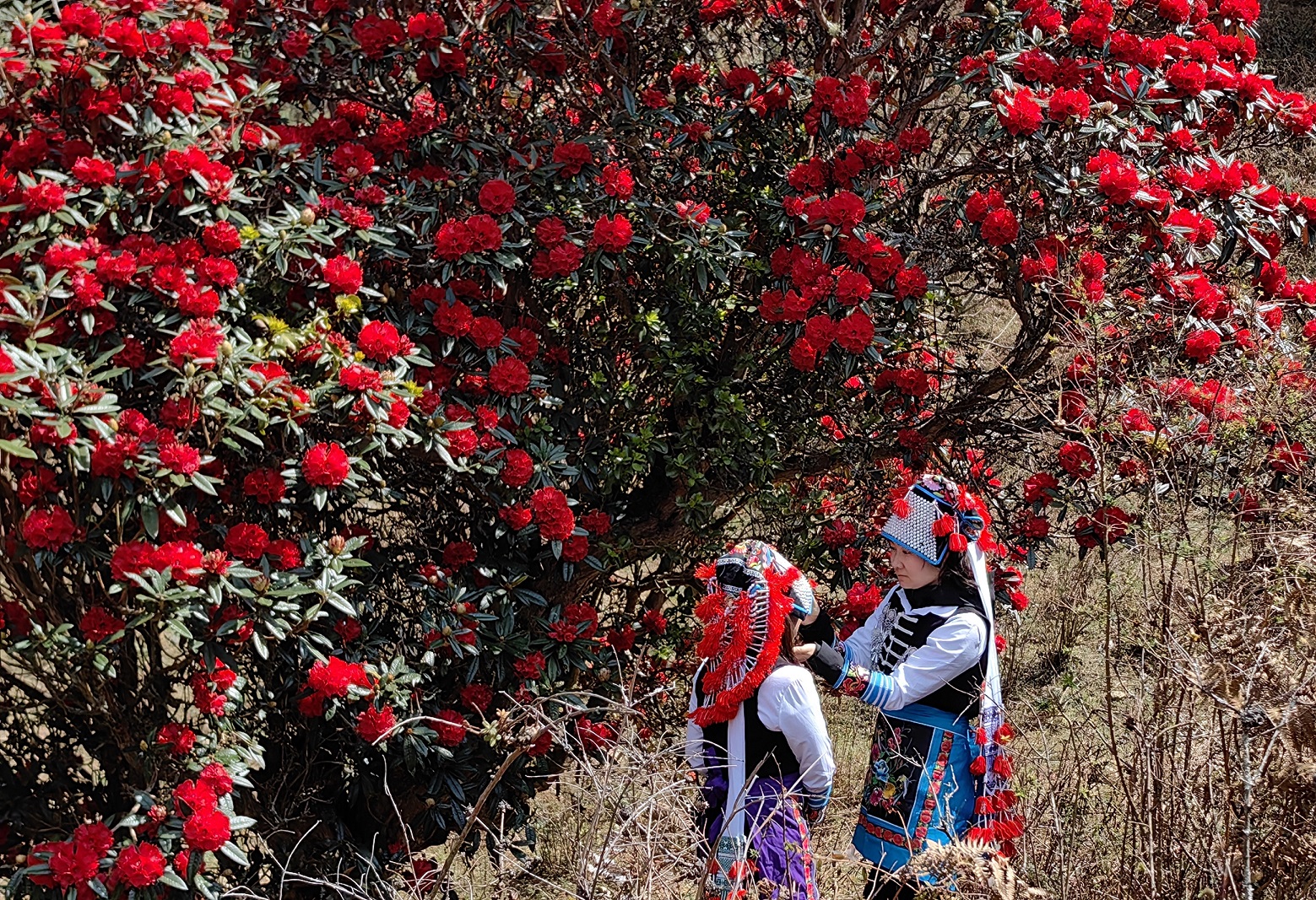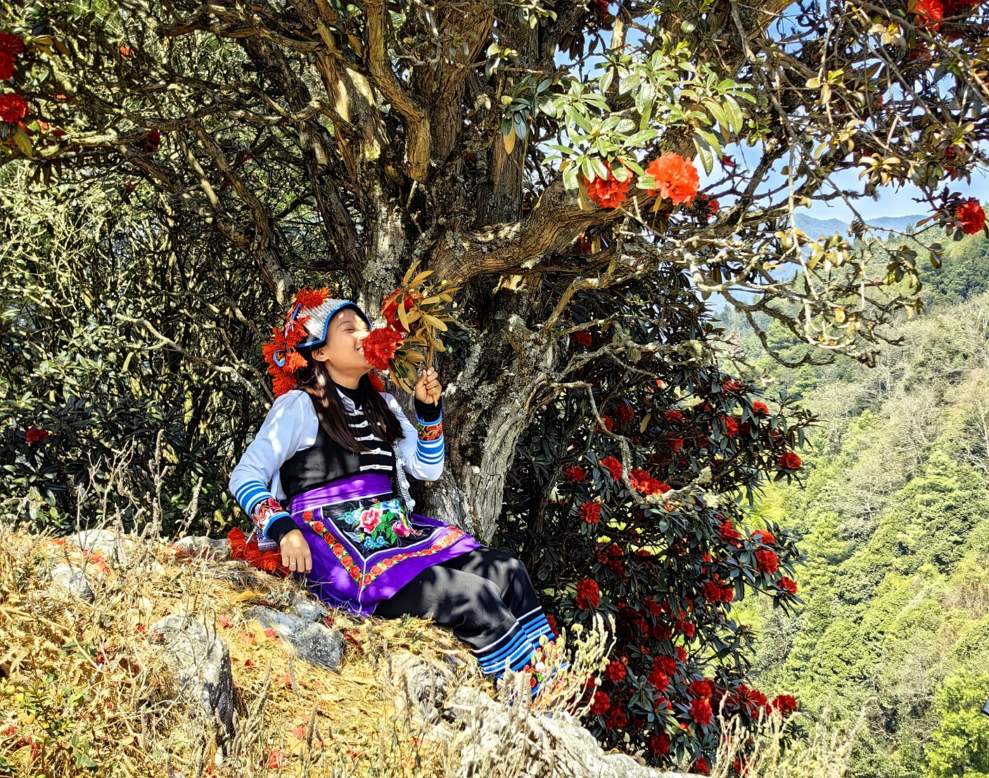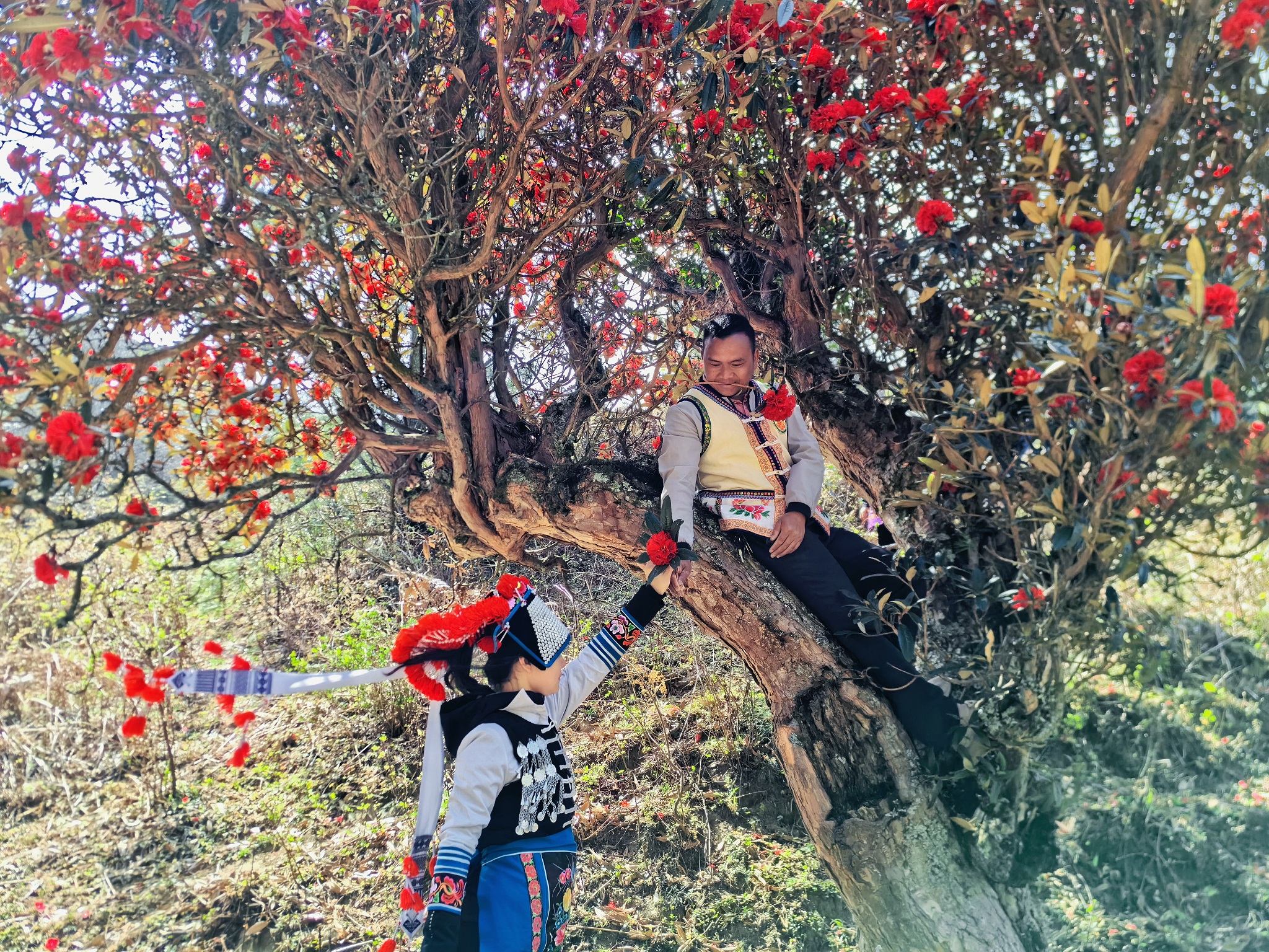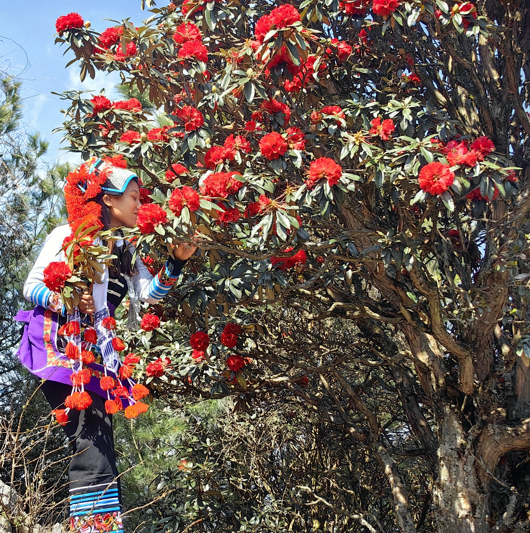 穿梭在上百年树龄的马缨花树林中,树干被岁月的苍穹篆刻出痕迹,苔藓覆盖其间,指尖轻触,似乎感受到哀牢彝山用这苍劲的灵魂守护着这一方的山水人文。每年的春天,身穿彝族服饰的青年男女都会相约来赏花打卡拍照,绚丽的民族服饰和火红的马缨花碰撞在一起,形成一幅“人花相映”的醉人美景。