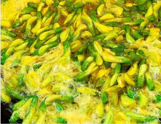金雀花,又称黄花菜,是云南春季的一种常见野菜。外观小巧精致,因形似小鸟而得此名,将金雀花和鸡蛋一起炒,灿黄喷香,甘甜鲜嫩,风味独特,是春季的一道美味佳肴。