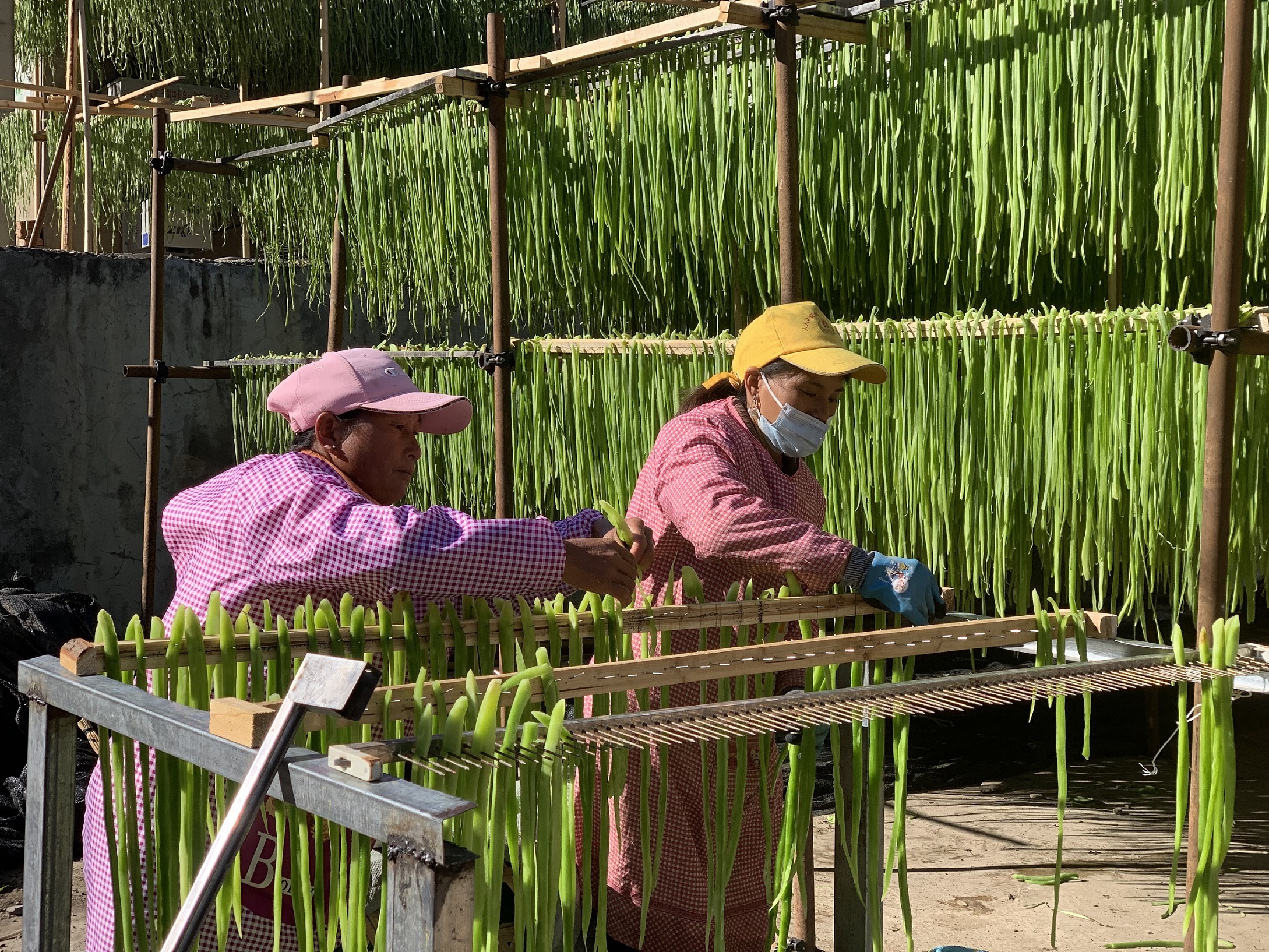 走进一街乡贡菜加工厂,首先进入眼帘的是晾晒广场上的一排排绿色贡菜条,远远望去,犹如染坊里正在晾晒的绿色染布。当风吹过时,绿色的贡菜帘像一片绿色的海浪,让人醉在了这抹绿色里。