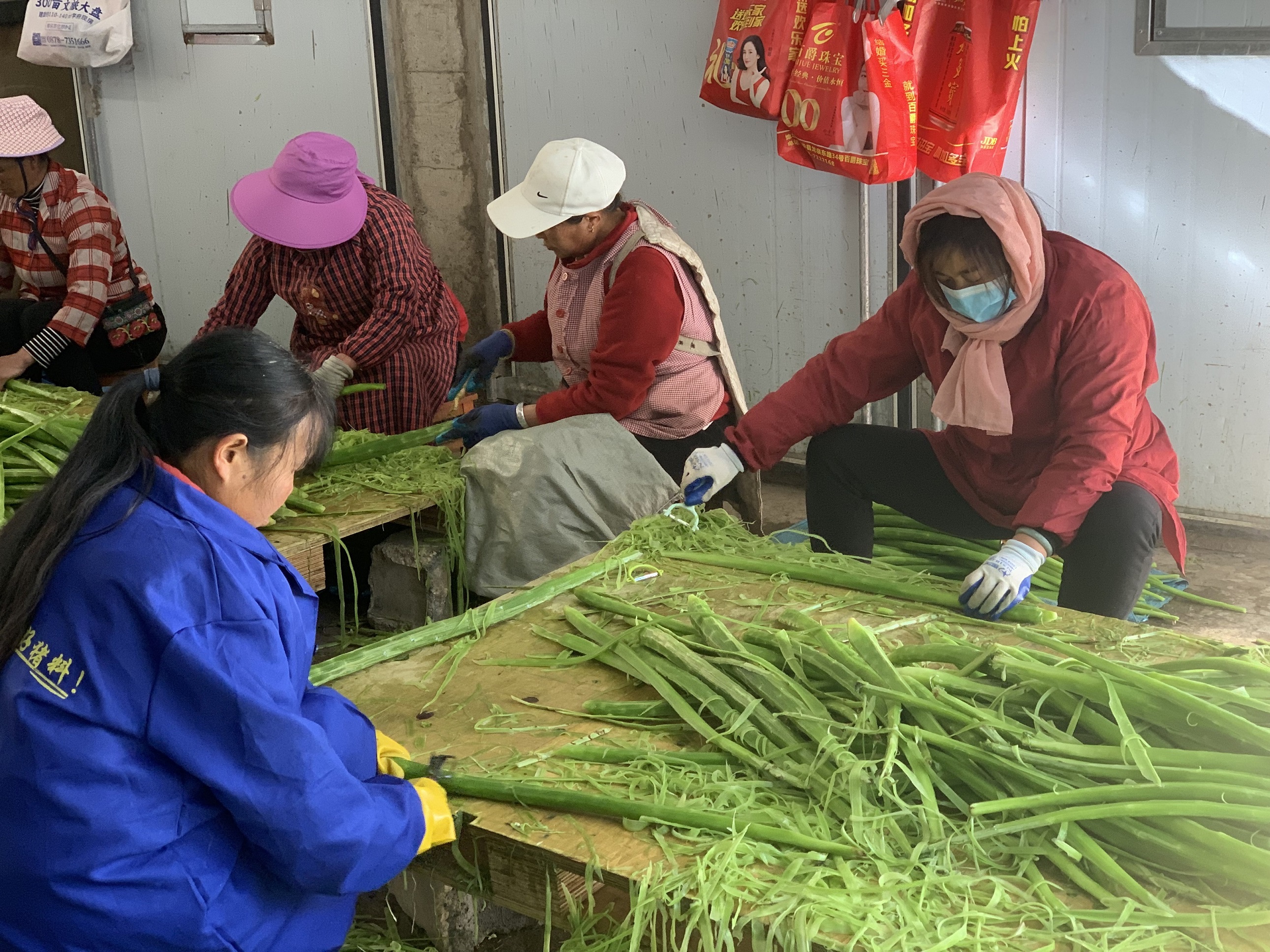 再往里走一走,进入加工车间,就看到工人们各自在自己的工位上忙着去根、削皮、腌制、划条、晾晒,一道道工序井然有序。贡菜加工的第一道工序是机器去根削皮,只见工人张大哥把贡菜放入机器一端,几秒过后,去好根、削好皮的贡菜就从机器另一端出来了。还有一部分工人在进行人工削皮,据介绍,这个工位主要负责去掉机器没有完全去掉的皮,如果不把贡菜皮去干净,就会严重影响到贡菜的口感,品质也会大打折扣。