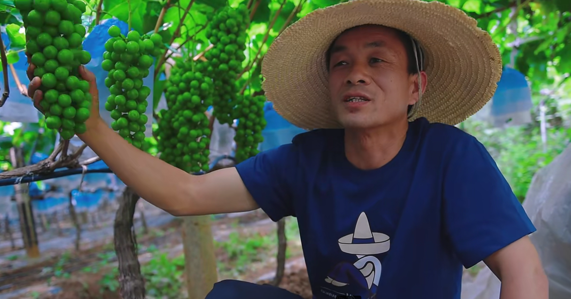该基地的负责人李之洪正和工人对葡萄进行疏果或摘叶心,以保证每串葡萄品质上乘。“阳光玫瑰”葡萄成熟时果粒呈现出清凉的绿色,甜度高、果实脆、香味似玫瑰,它满足了人们“吃葡萄不吐葡萄皮”的美好愿望,轻薄的果皮可以轻松入口、不苦不涩,被称为果中“新贵”,深受消费者的喜爱。
