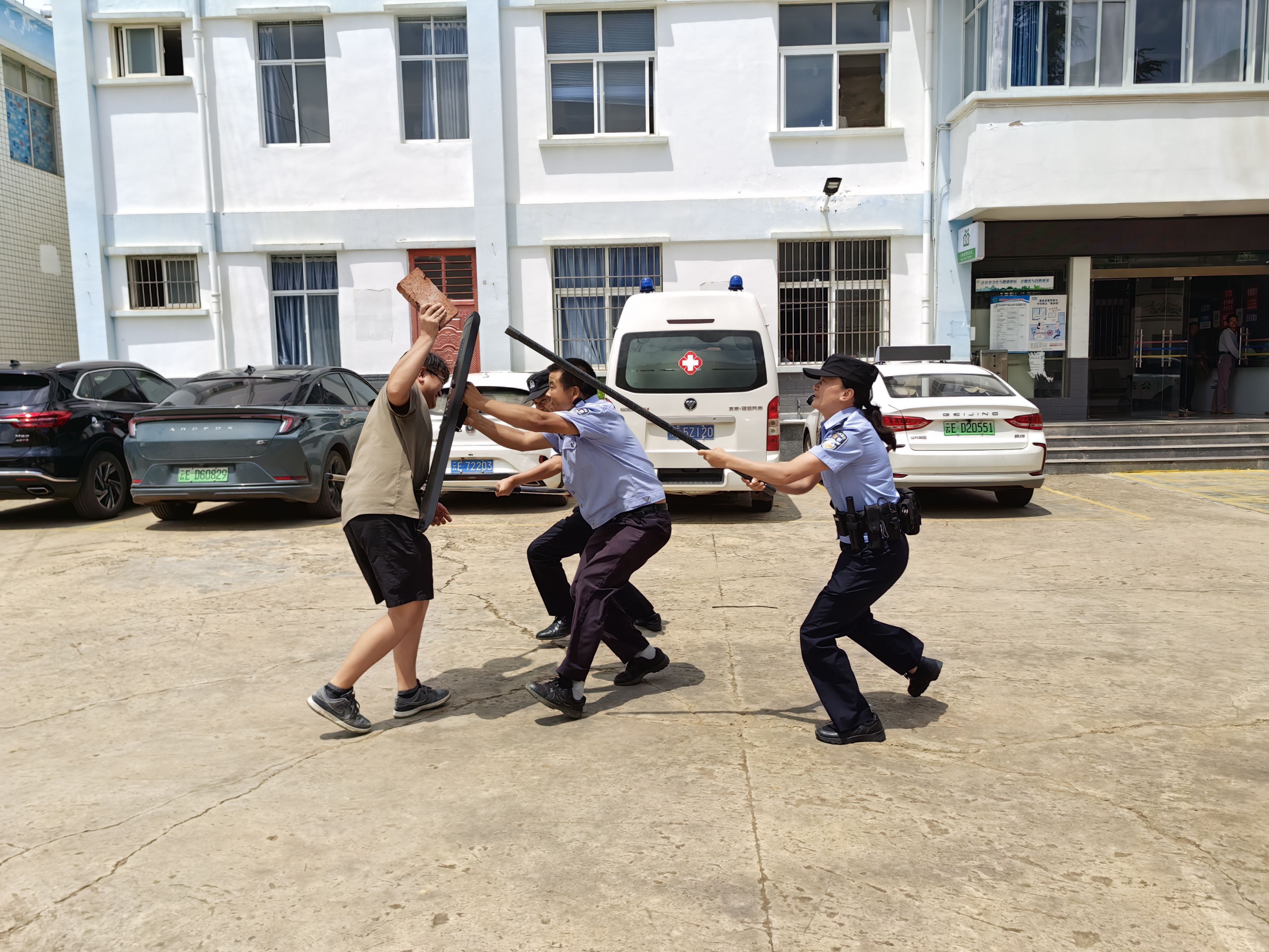 演练中,民警向医护人员介绍常见暴恐事件类型,并对齐眉棍、胸叉、盾牌等基础防暴器械的正确使用方法、使用技巧进行培训,面对突发情况的配合方式、持械方法、进攻步骤和注意事项。随后,民警设置一起暴徒持砖头无差别攻击医院人员的警情进行现场演练,对遇到突发事件时医院如何疏散就诊患者、如何前期自保、自救、如何配合公安机关进行处置进行全方位展示。