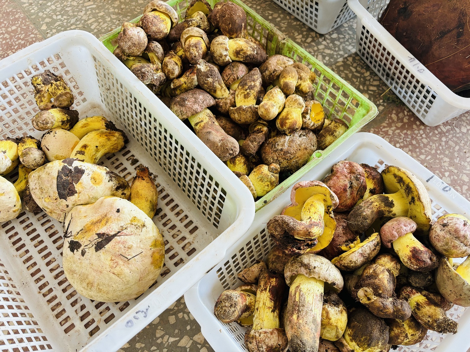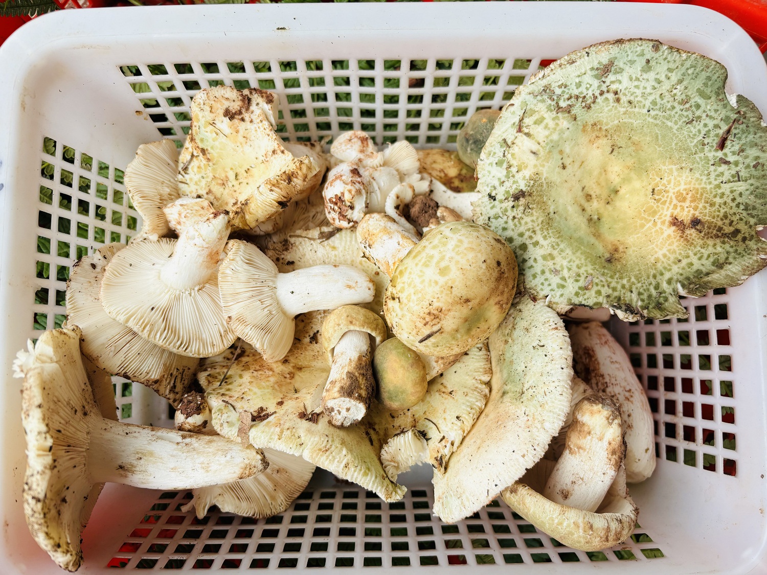 在五街镇野生菌收购商鲁有胜家,店里摆满了一筐一筐的葱菌。红葱颜色艳丽,菌杆是鲜红色过渡到鲜黄色,俗称“红见手”,菌香浓郁;紫葱颜色更为暗沉,带有独特的酸脆感;白葱看起来则是细嫩洁白,菌肉肥厚,味微酸而香甜。除了葱菌,还有少量青头菌,绿白相见的菌帽清新脱俗,惹人喜爱。