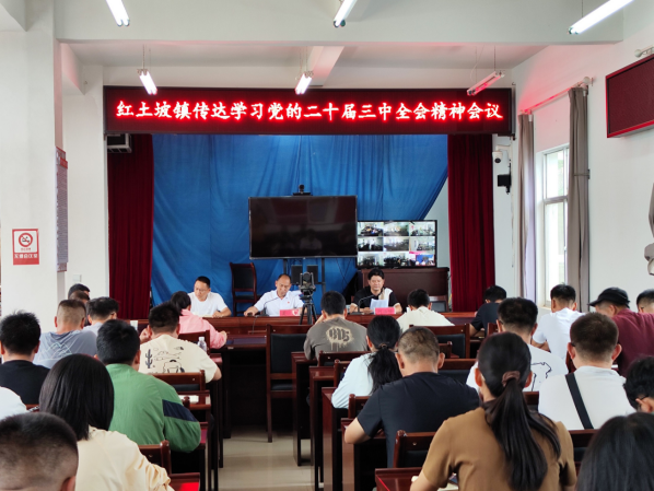 7月23日,红土坡镇召开会议,专题传达学习党的二十届三中全会精神,会议以视频形式召开到各村党总支,全镇干部职工在主会场参会,各村“四职”干部和驻村工作队员在分会场参会。