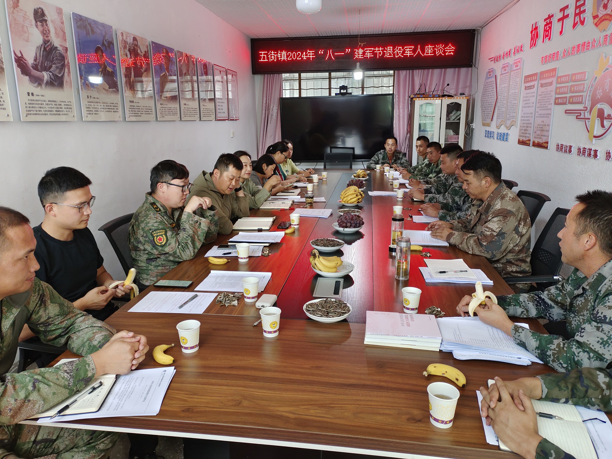 为热烈庆祝中国人民解放军建军97周年,8月1日下午,五街镇召开2024年“八一”建军节退役军人座谈会,镇党政班子成员和镇属退役军人、退役军人服务站工作人员参加座谈会。