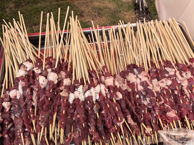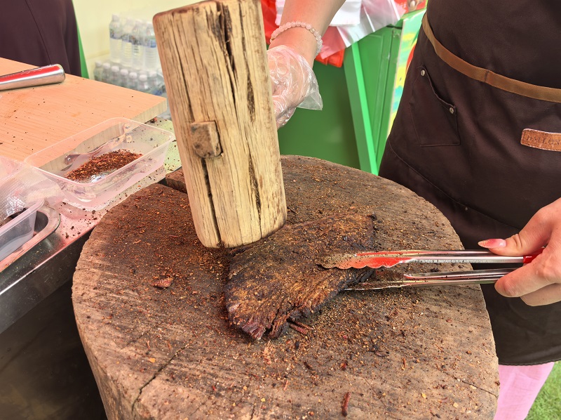 拐角处的烟火最盛,展位前人头攒动。烤全羊架在炭火上,表皮烤得金红油亮,师傅握着长柄刀,片下的肉卷着热气,混着孜然与芝麻的香,引得排队的人直抻脖子。旁边的烤炉上,羊肉串滋滋冒油,肥瘦相间的肉块烤得焦香,火星子偶尔溅起,映得摊主额头的汗珠发亮。小锤干巴摆在烤架上,深褐色的肉条泛着油光,有人拿起一根嚼着,越嚼越觉咸香漫开来,忍不住又抓了一把。