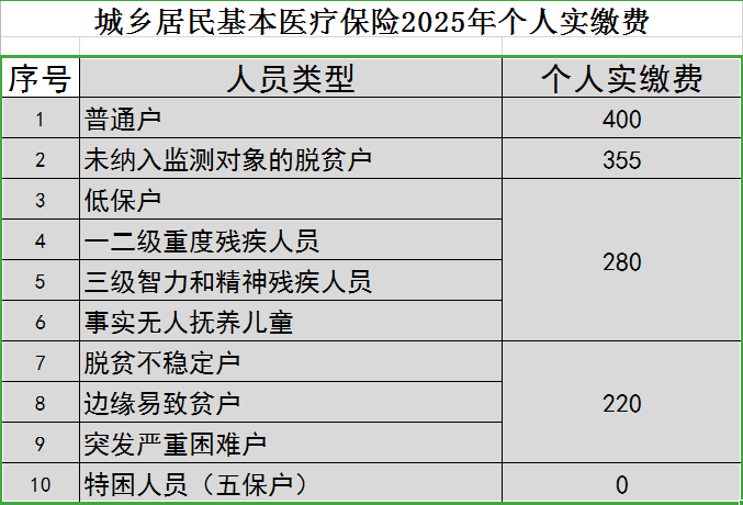 特殊人员资助标准:1.特困人员实缴0元/人(按照400元全额予以资助);2.低保对象、一二级重度残疾人、三级智力和精神残疾人实缴280元/人(按照120元予以资助);3.经民政部门认定的低收入家庭中的60周岁以上贫困老年人和未成年人、事实无人抚养儿童实缴280元/人(按照120元予以资助);4.纳入乡村振兴部门防止返贫致贫监测对象的农村低收入人口(脱贫不稳定户、边缘易致贫户、突发严重困难户)实缴220元/人(按照180元予以资助);5.未纳入乡村振兴部门防止返贫致贫监测对象的脱贫人口实缴355元/人(按照45元予以资助);6.按缴费时的人员身份对应标准缴费后人员身份变动的,已缴费用不退、不补。符合多种资助参保条件的,按照“就高”原则给予参保资助,不得重复享受。