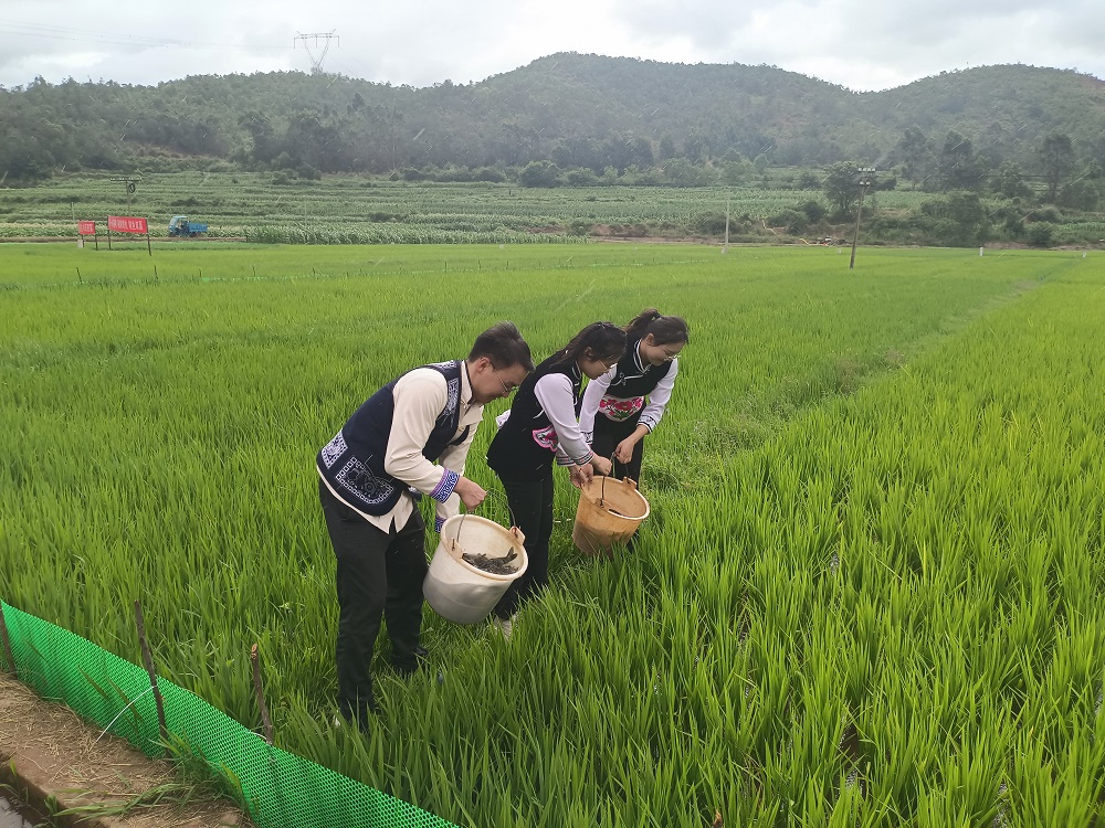 金秋十月,稻浪起伏,稻谷飘香。在雨露乡罗文村稻田养鱼基地,忙着收割稻谷的群众正穿梭在田间地头,与别处的田块相比,这里的稻谷有些特别:把优质鱼苗投放进水田,让稻花鱼和优质粳米搭档,一同成长,相互滋养。
