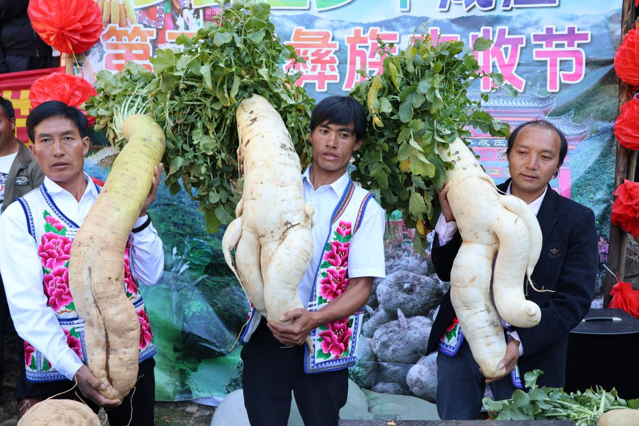 本次彝族丰收节“农王”争霸赛参赛的瓜果蔬菜品种类繁多,有白萝卜、南瓜、魔芋等。争霸赛的奖品颇接地气,获得“农王”称号的群众,奖励种羊1头,第二名奖励小猪1只,第三名奖励2只大公鸡。
