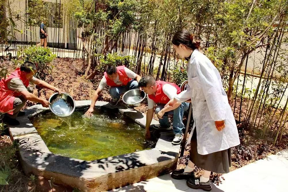 活动当天,斗山社区日间照料中心院内人头攒动,热闹非凡。“医务社工”在为前来参与活动的百余名银龄老人测量着血压,“后勤志愿者”在准备着中彝药材的温煮,“卫生志愿者”在对泡池灌药之前做着最后的清洗和检查准备。