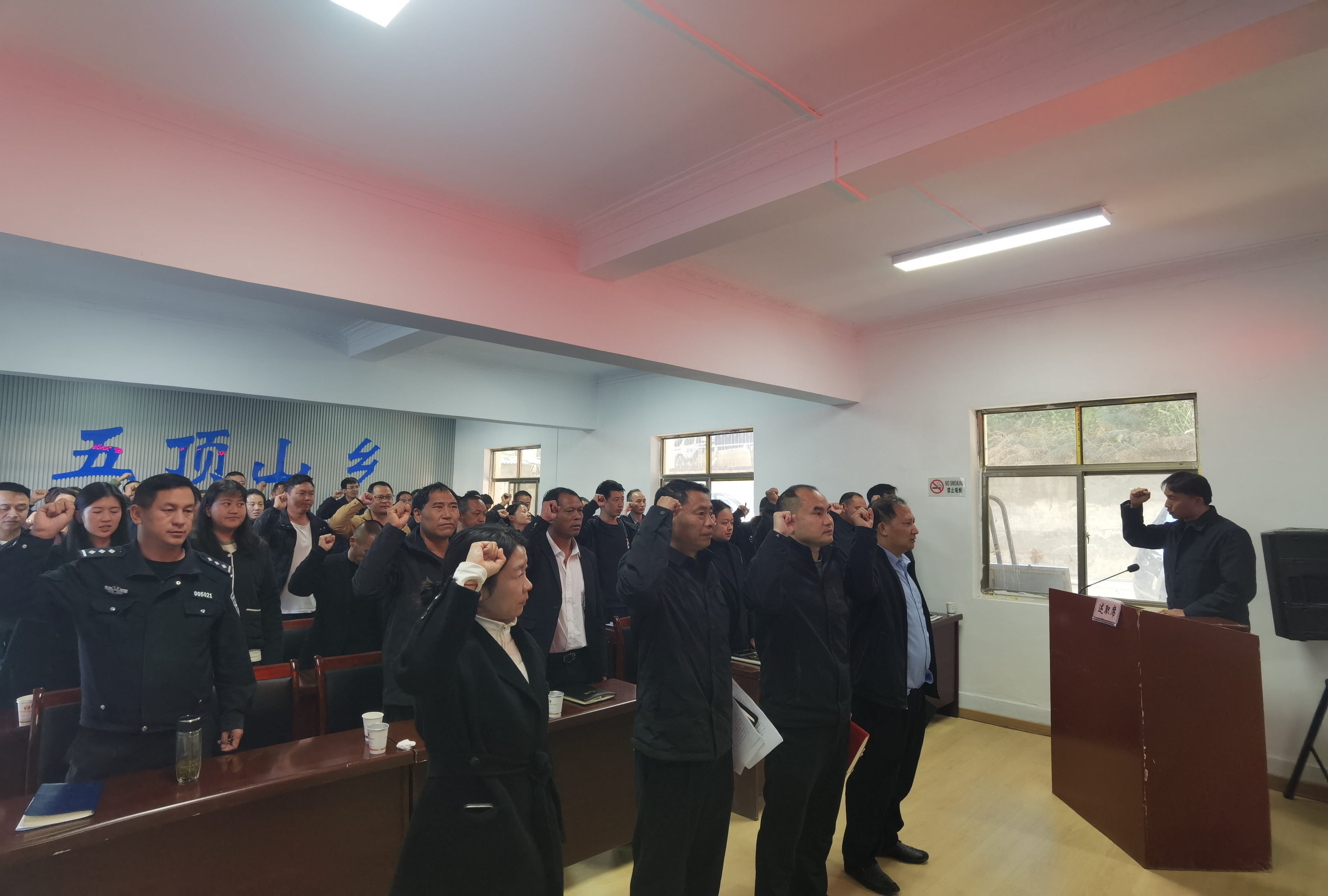 为深入贯彻宪法精神,激励和引导干部职工自觉维护宪法权威,履行法定职责,忠于宪法、遵守宪法、维护宪法,不断提高自身素质和能力,近日,五顶山乡组织开展宪法宣誓活动,乡内全体干部职工、各村“两委”成员、各上管单位负责人共计63人参加了此次宣誓。