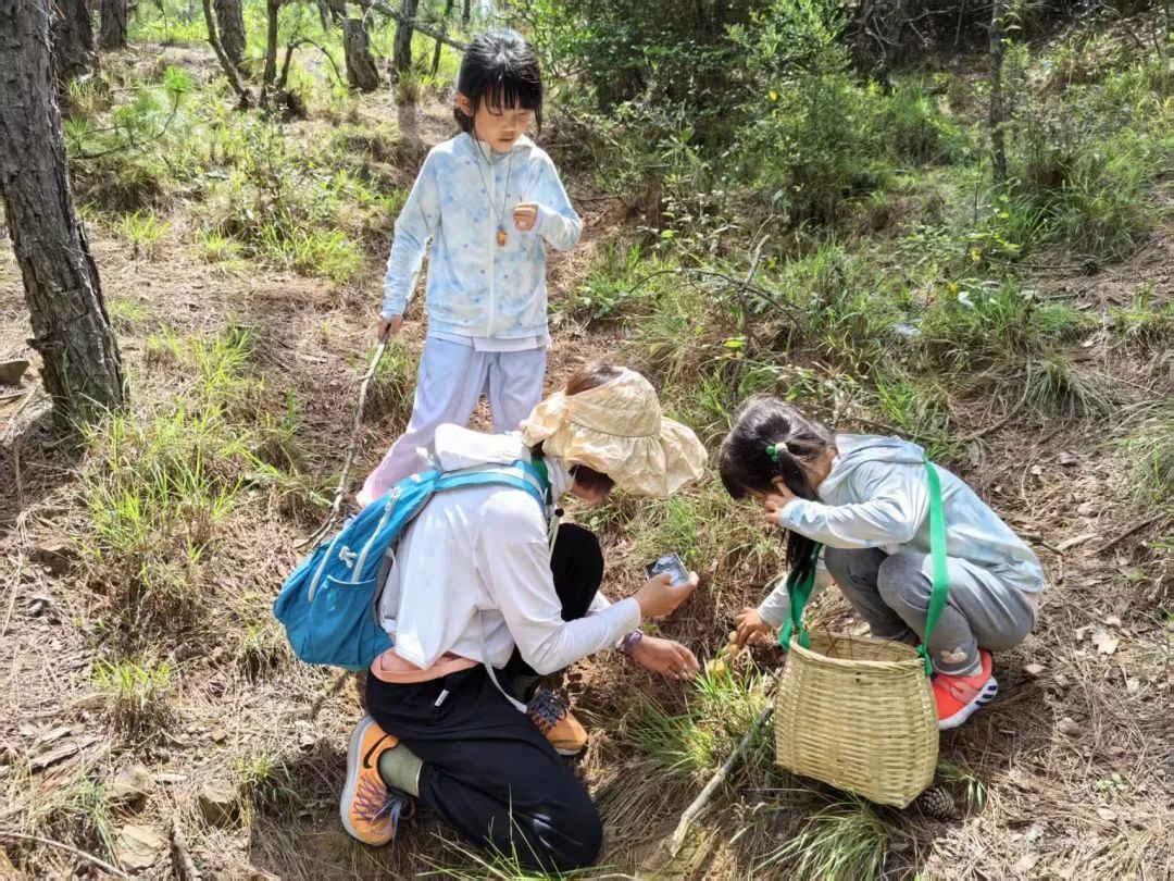 回到秋葉田,随之而来的是一堂生动的蘑菇识别·野趣研学课堂。“白牛肝,又叫白葱、白牛头,主要分布在海拔1000-2200m的地区,菌盖扁半球形、表面光滑不粘手,边缘钝,呈黄褐色、土褐色或红褐色......”“刚才老师讲了,你这个应该是红牛肝,它还有个名字叫红葱......”“一朵野生菌的生成主要通过孢子萌发、菌丝生长和扩展、子实体形成完成的,再通过孢子释放与传播,开始新的生长周期……”对比老师的讲授,孩子们拿着刚找回的野生菌仔细识别着、津津乐道讨论着。