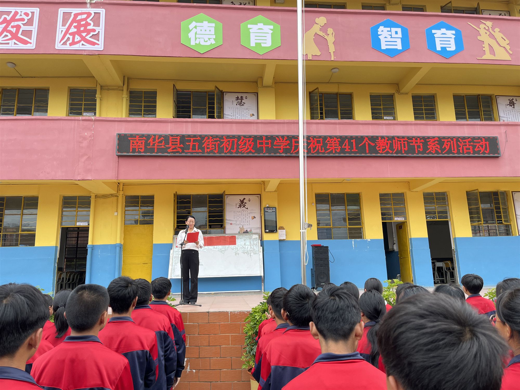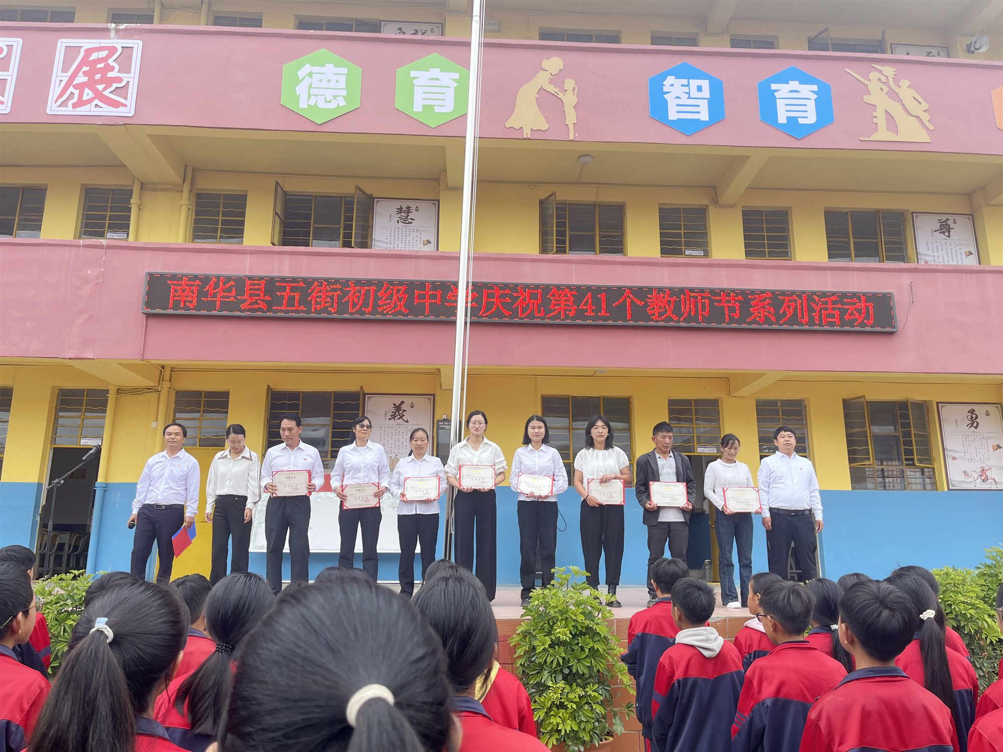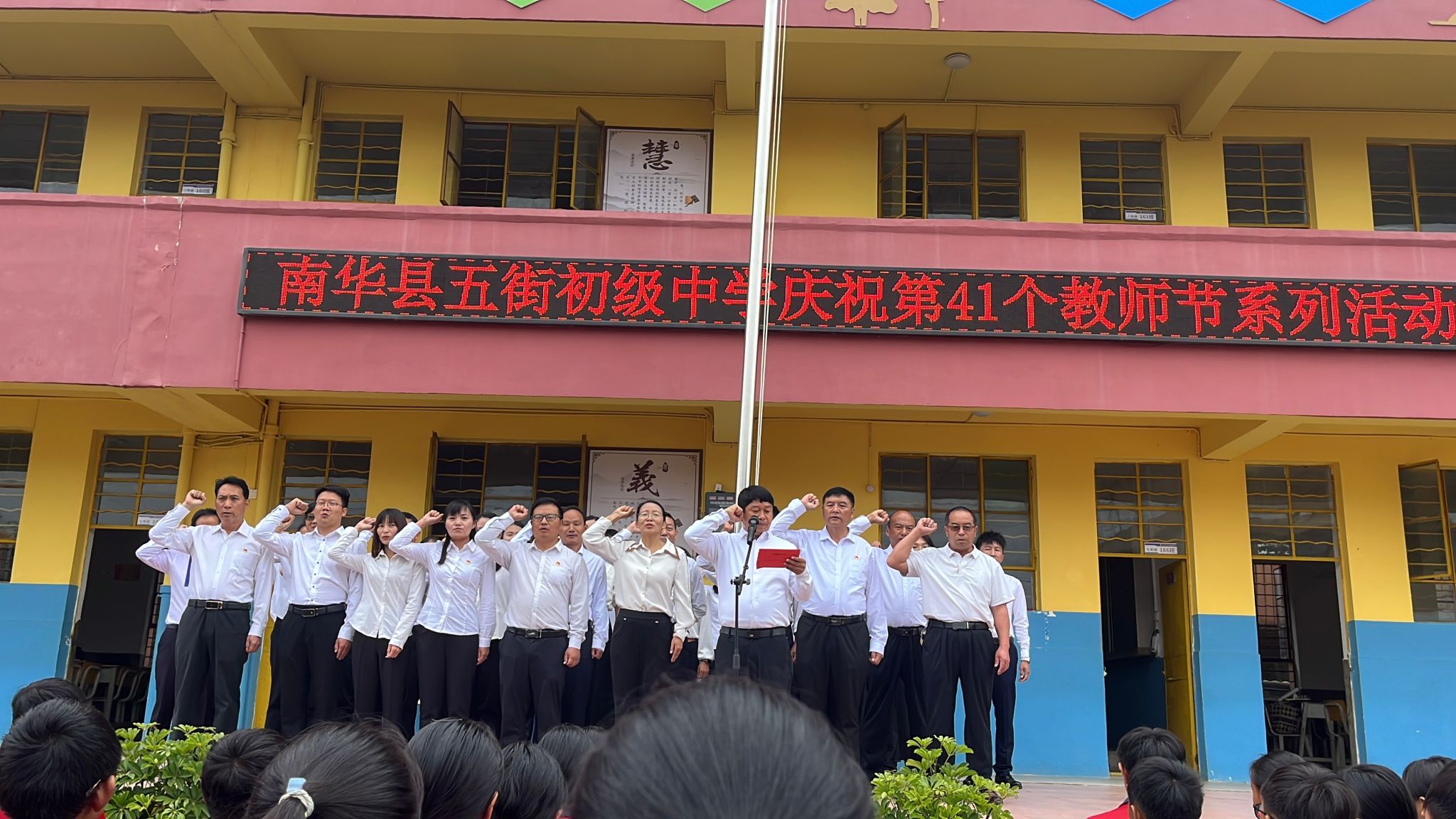 9月10日,南华县五街初级中学在学校教学楼前庄严集会,举行以“感恩老师,难忘师恩”为主题的第41个教师节庆祝活动。全校师生共同参与,现场气氛热烈而感人。