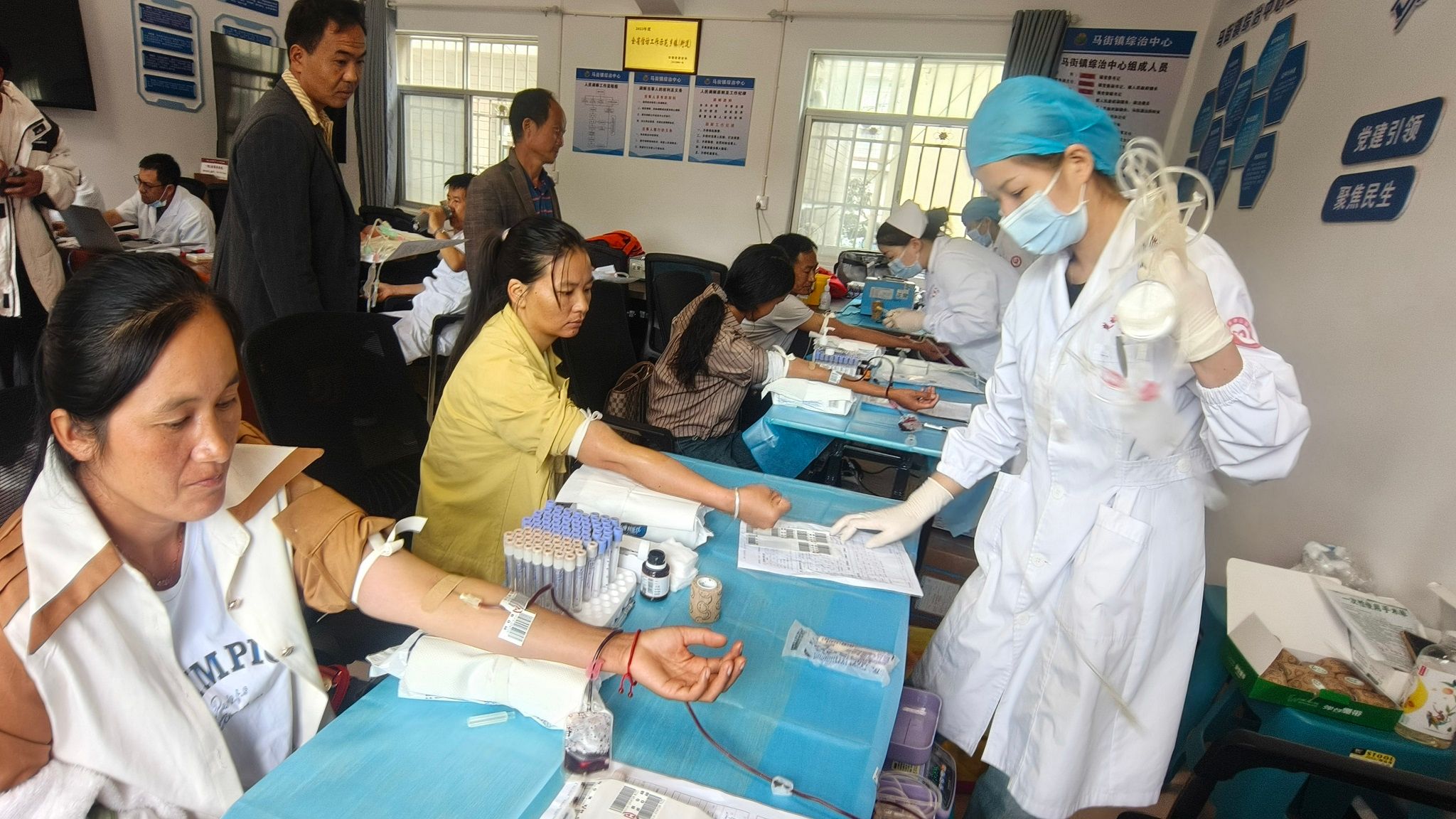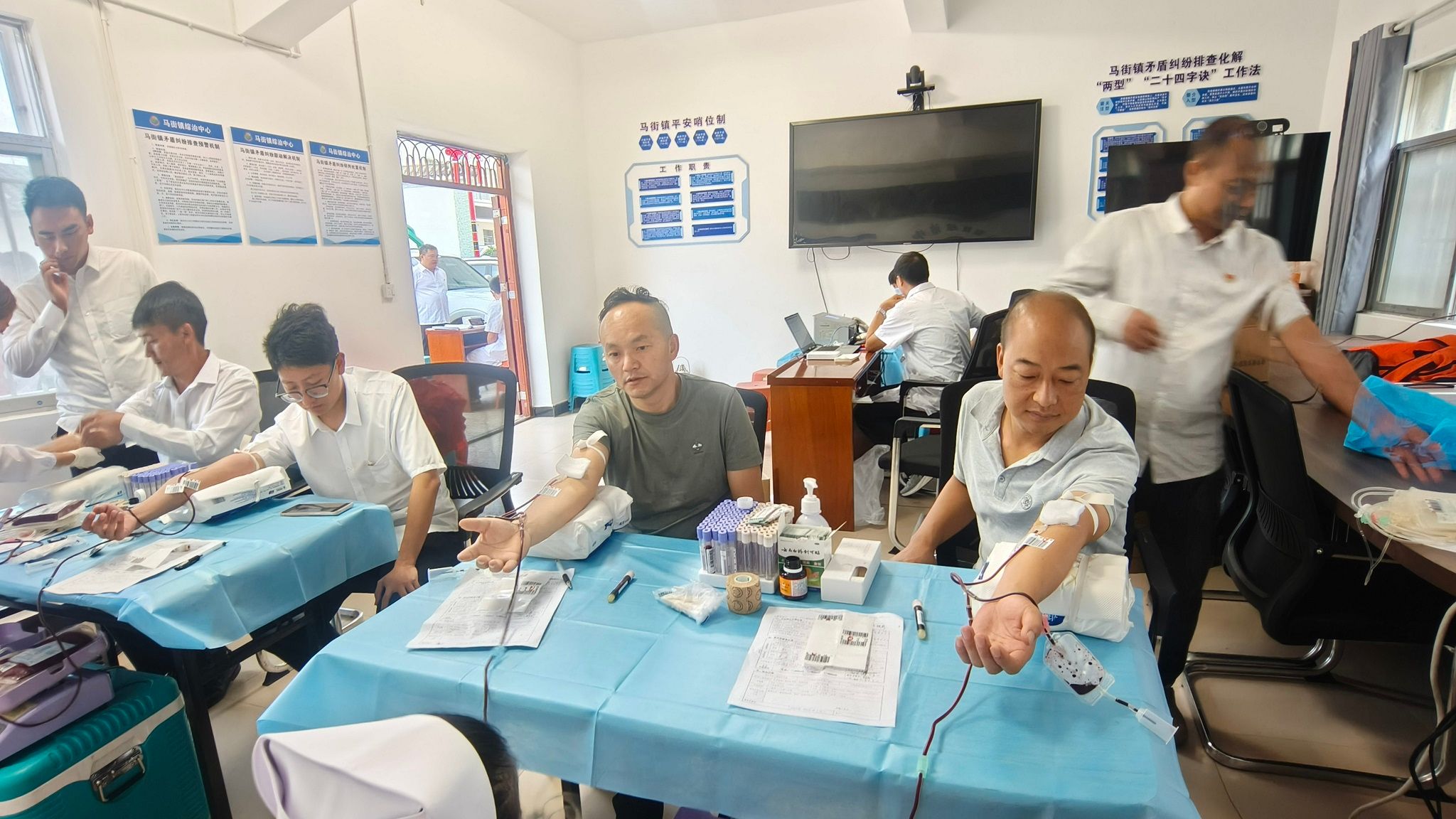 活动现场,来自镇级机关、上管单位、13个村委会的干部职工及热心群众有序配合志愿者和医护人员,依次完成信息登记、血压测量、血型检测等流程,最后,符合条件的人员进入到献血环节。