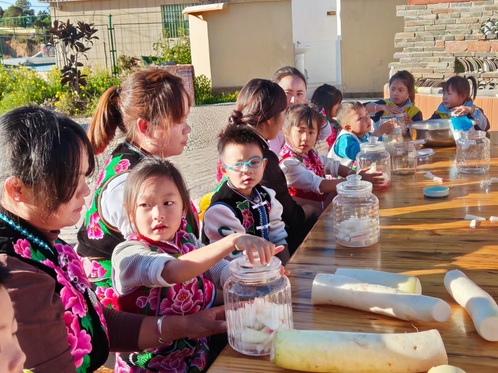 没过多久,大家都收获满满,小朋友们带着自己亲手拔的萝卜回到了彝风小院里,他们开始在老师和家长的陪同下动手洗萝卜、切萝卜、腌萝卜,小朋友们小心翼翼地将萝卜切片、调味、封装。看着自己亲手腌制的萝卜,孩子们眼中充满了期待和喜悦。