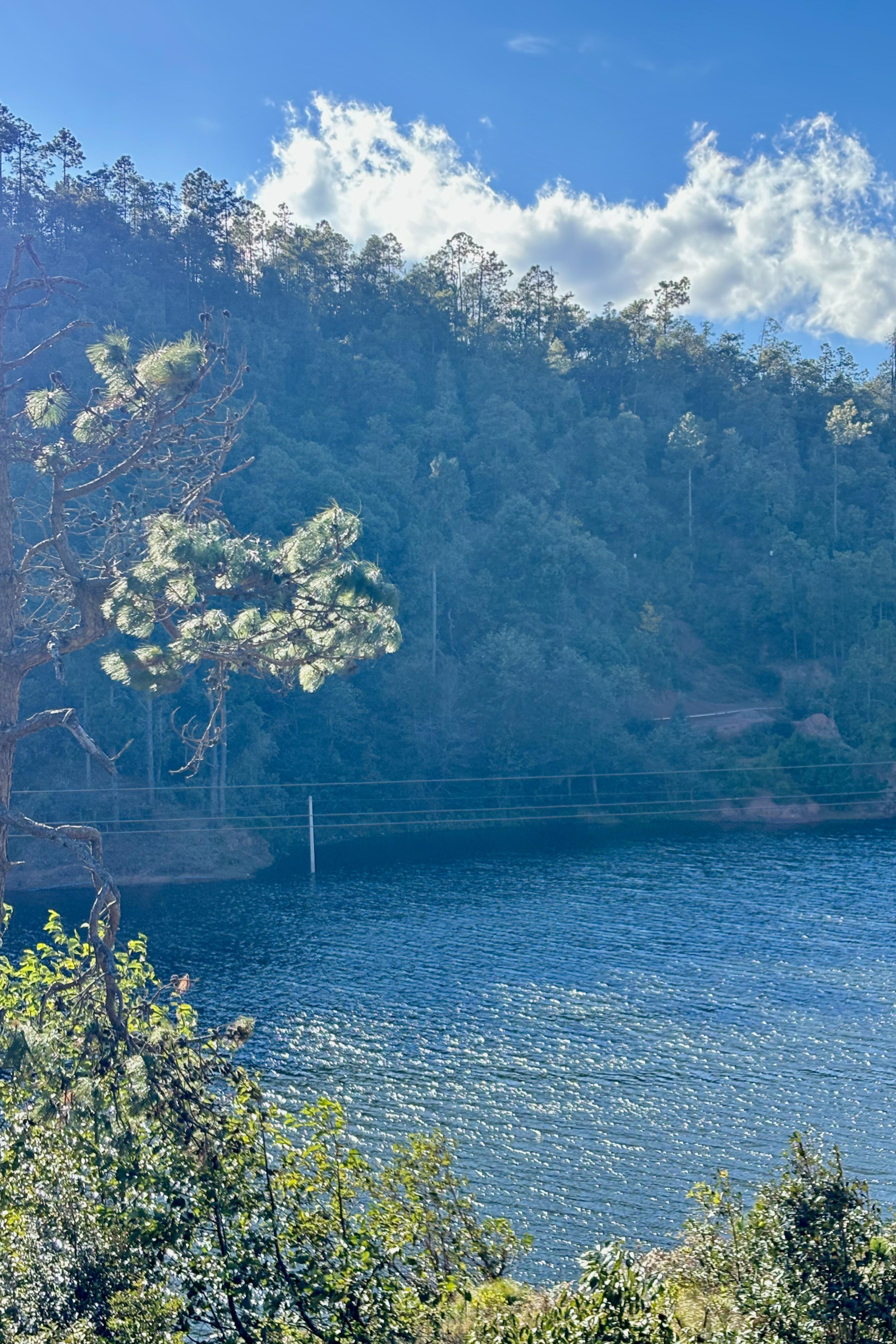 湛蓝的天空如同一块巨大的蓝宝石,悬挂在松茸湖的上方,与湖水交相辉映,形成了一幅美丽的天际线。湖水清澈见底,宛如一面明镜,将天空的美景尽收眼底。