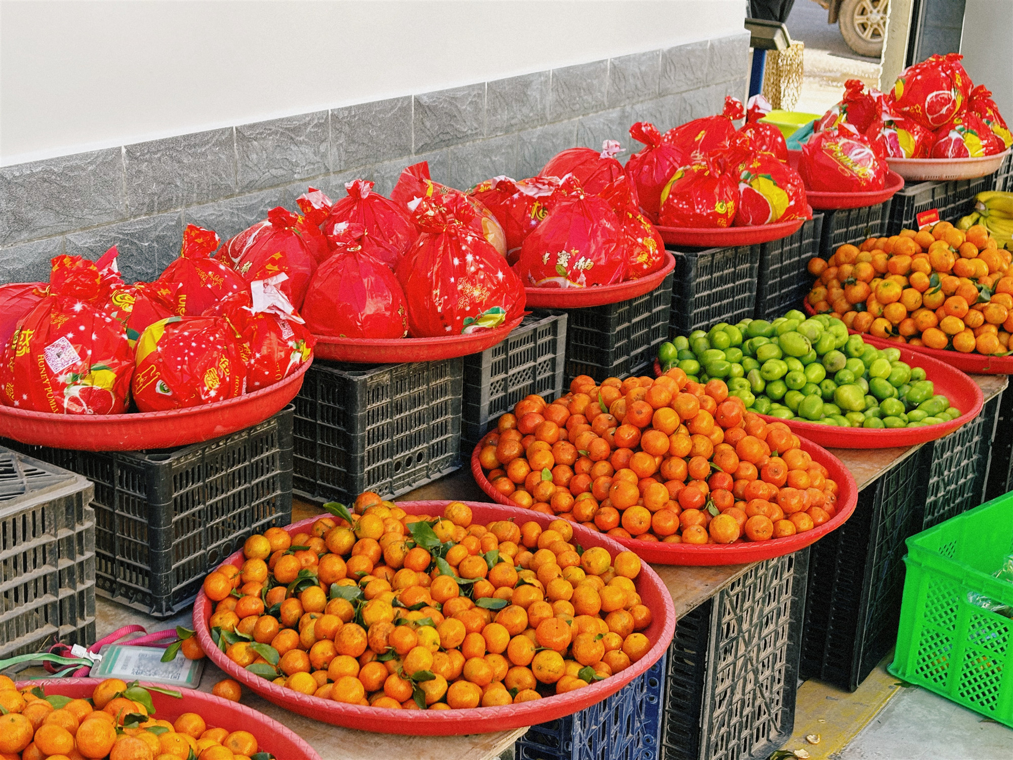 紧挨着蔬菜区的,是水果区。这里的水果种类繁多,色彩斑斓。金灿灿的小橘子、鲜红的苹果、绿莹莹的大青枣……散发着诱人的果香。顾客们络绎不绝,纷纷停下脚步,挑选着心仪的水果。