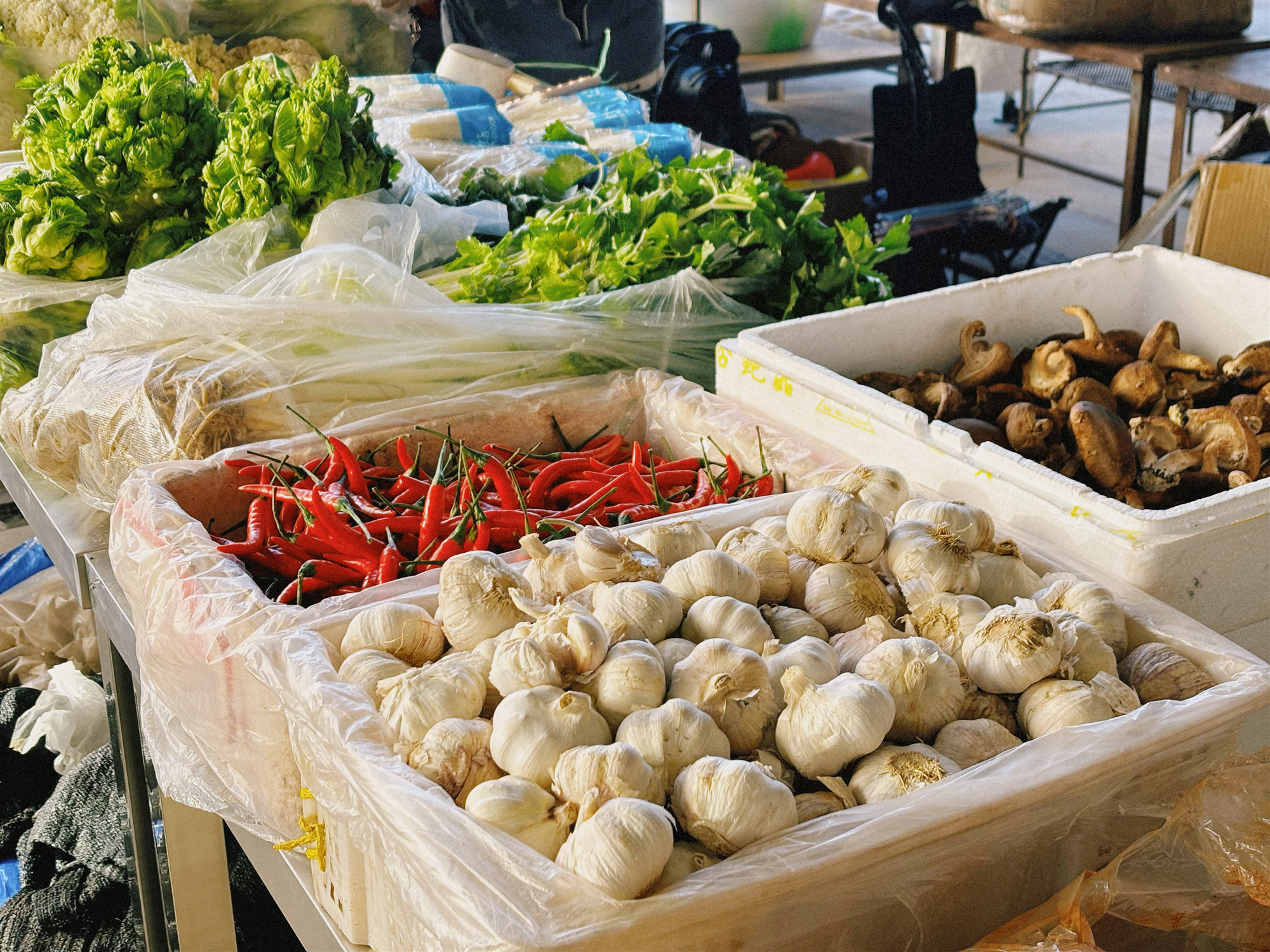 在新鲜蔬菜区,一个个摊位上堆满了各式各样的蔬菜。鲜脆的萝卜、翠绿的菠菜、鲜红的番茄、圆滚滚的土豆……这些蔬菜还带着清晨的露珠,显得格外新鲜。摊主们热情地招呼着顾客,为他们挑选着最鲜嫩的菜品。